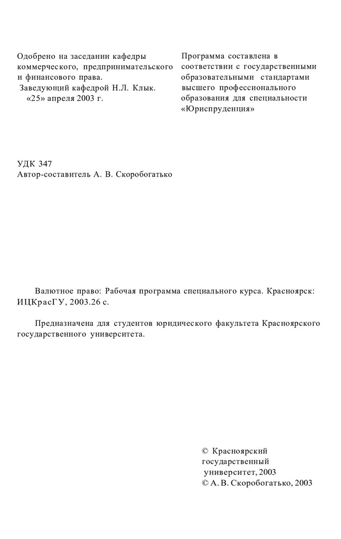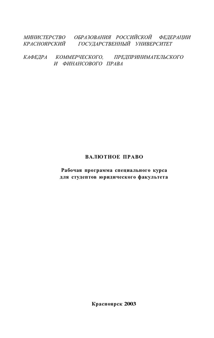 Библиографическое описание:Валютное право : рабочая программа спец. курса для студентов юрид. фак. / Краснояр. гос. ун-т. Юрид. ин-т ; сост. А. В. Скоробогатько. - Электрон. текстовые дан. - Красноярск : ИЦ КрасГУ, 2003. - (Электронная библиотека СФУ). - Загл. с титул. экрана. - Текст : электронный.