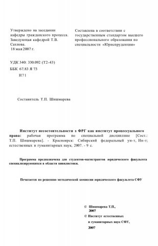Институт несостоятельности в ФРГ как институт процессуального права : рабочая программа по спец. дисциплине (магистерская программа "Гражданский процесс, арбитражный процесс")