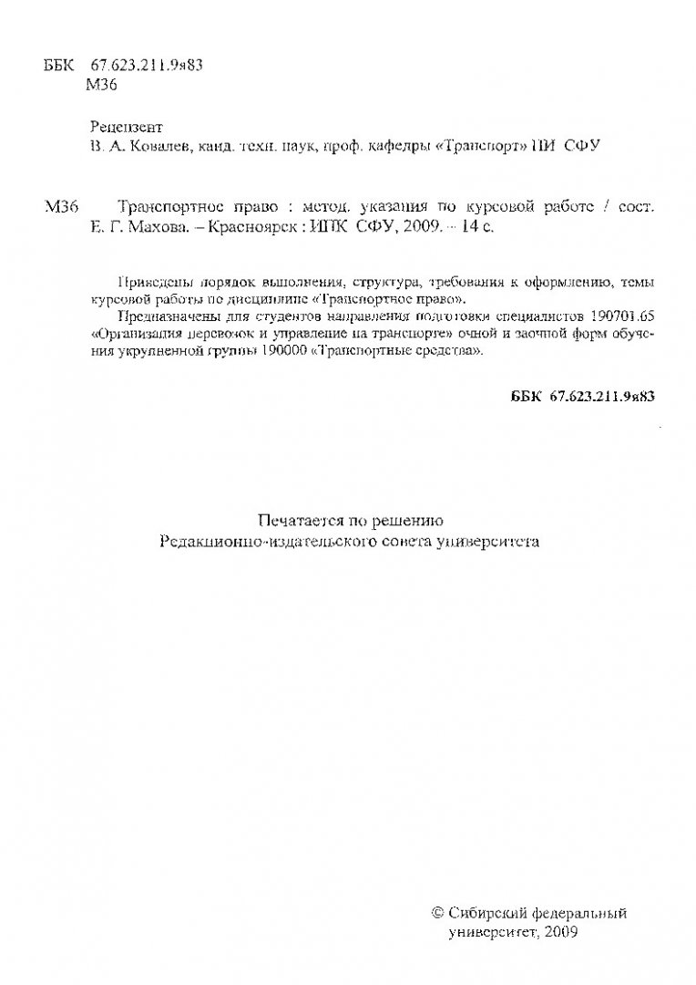 Библиографическое описание:Махова, Елена Геннадьевна. Транспортное право : методические указания по курсовой работе / Е. Г. Махова ; Сиб. федер. ун-т, Политехн. ин-т. - Красноярск : ИПК СФУ, 2009. - 14 с. - Библиогр.: с. 10. - 90 экз. - Текст : непосредственный + Текст : электронный.