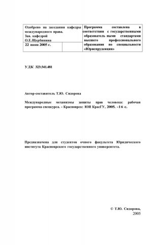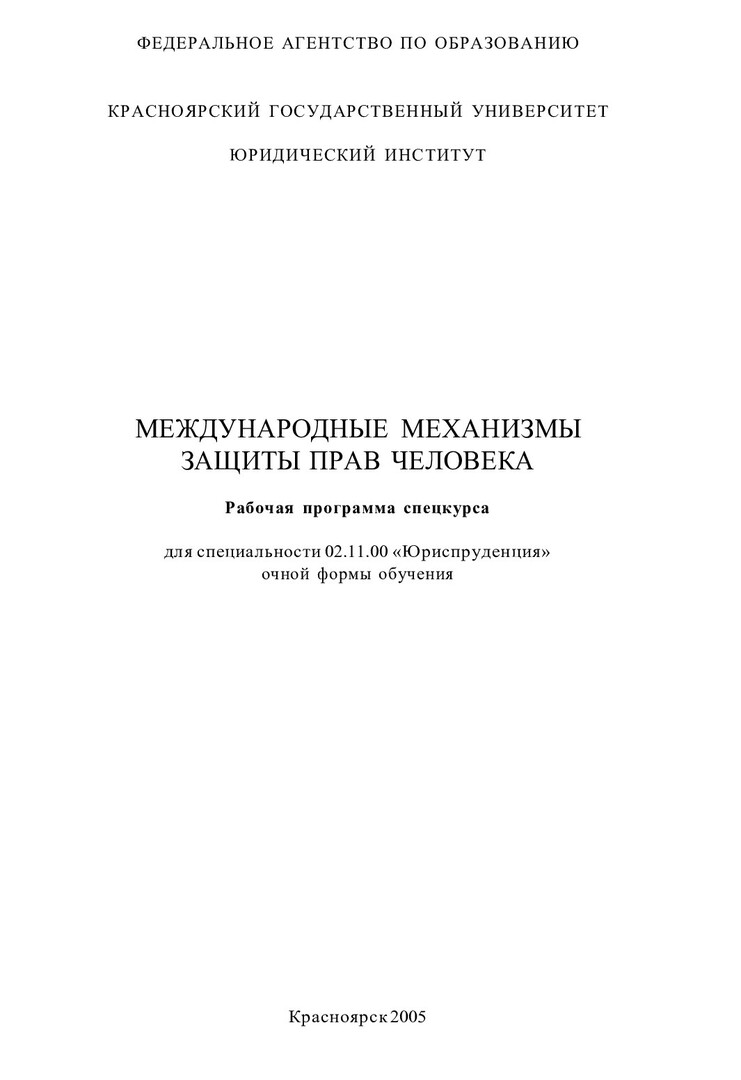 Библиографическое описание:Международные механизмы защиты прав человека : рабочая программа спецкурса для спец. "Юриспруденция" очной формы обучения / сост. Т. Ю. Сидорова. - Электрон. текстовые дан. - Красноярск : ИЦ КрасГУ, 2005. - (Электронная библиотека СФУ). - Загл. с титул. экрана. - Текст : электронный.
