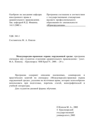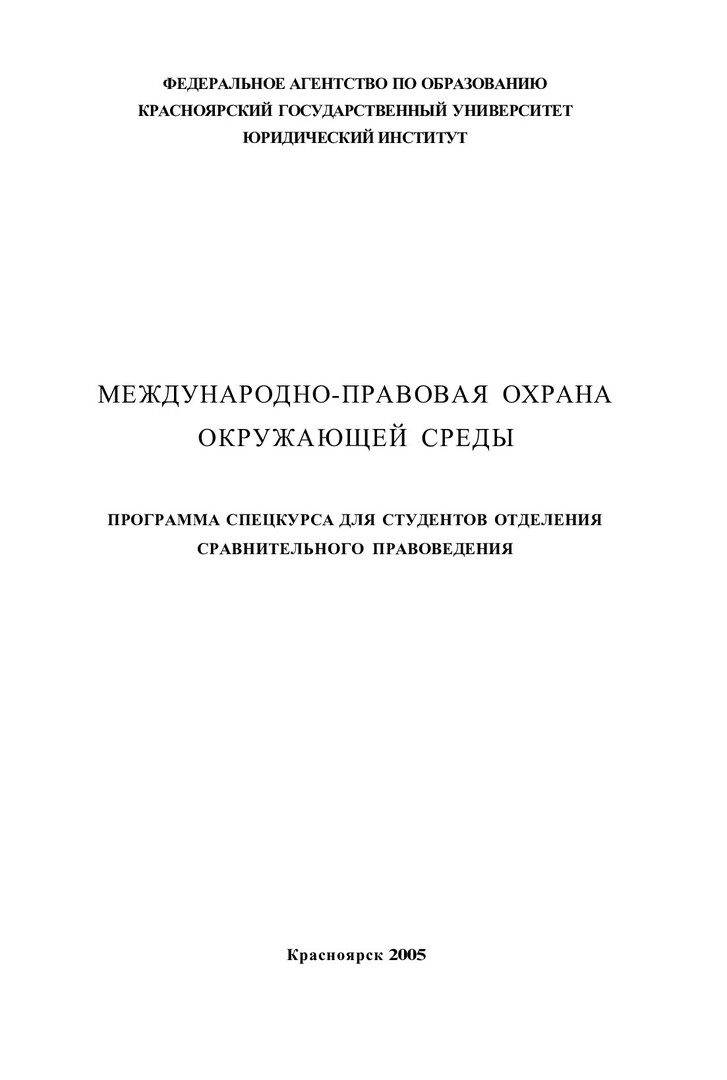 Библиографическое описание:Международно-правовая охрана окружающей среды : программа спецкурса для студентов отд-ния сравнительного правоведения / Краснояр. гос. ун-т. Юрид. ин-т ; сост. М. А. Князев. - Электрон. текстовые дан. - Красноярск : ИЦ КрасГУ, 2005. - (Электронная библиотека СФУ). - Загл. с титул. экрана. - Текст : электронный.