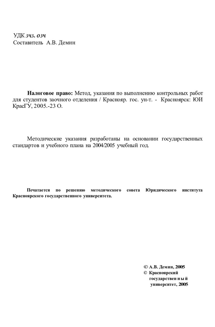 Библиографическое описание:Налоговое право : метод. указ. по выполнению контрол. работ для студентов заоч. отд-ния / Краснояр. гос. ун-т. Юрид. ин-т ; сост. А. В. Демин. - Электрон. текстовые дан. - Красноярск : ИЦ КрасГУ, 2005. - (Электронная библиотека СФУ). - Загл. с титул. экрана. - Текст : электронный.