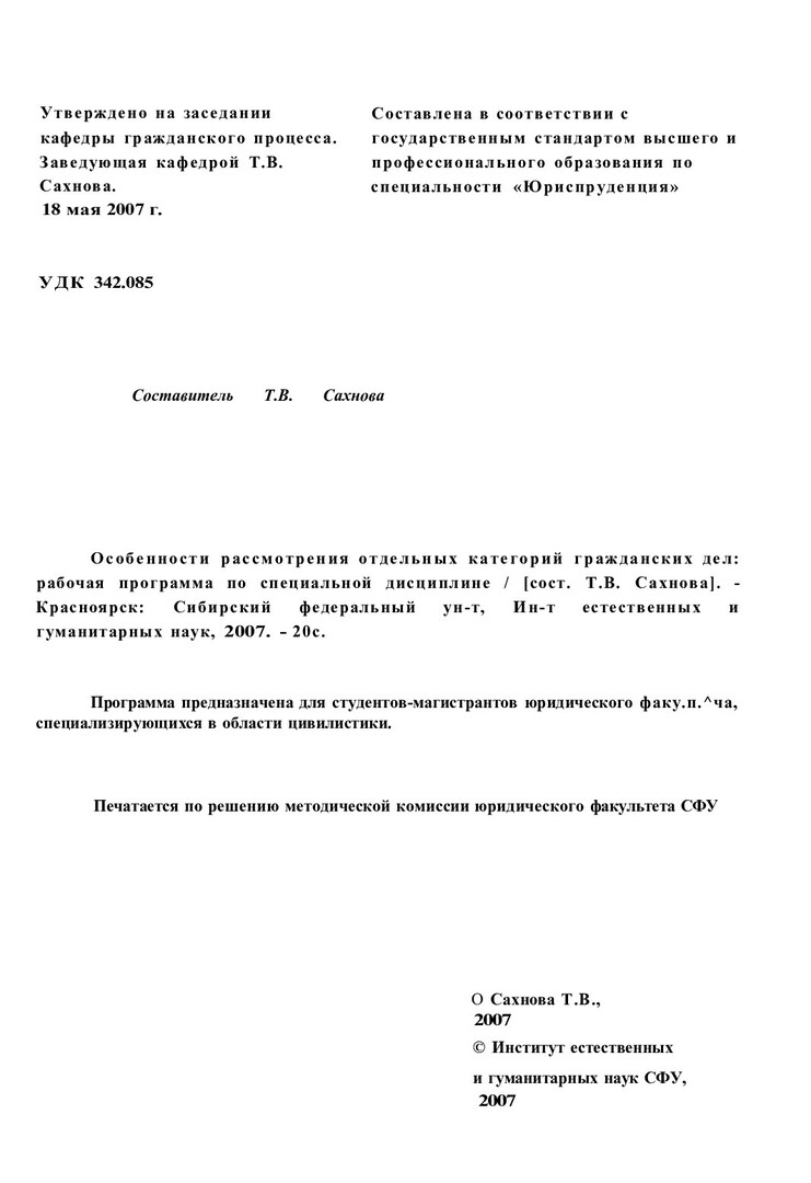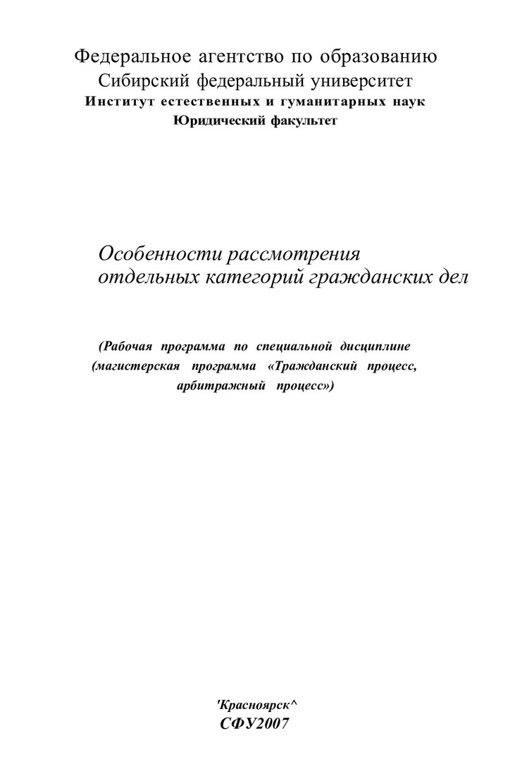 Библиографическое описание:Особенности рассмотрения отдельных категорий гражданских дел : рабочая программа по спец. дисциплине (магистерская программа "Гражданский процесс, арбитражный процесс") / Сиб. федерал. ун-т. Ин-т естеств. и гуманитар. наук. Юрид. фак. ; сост. Т. В. Сахнова. - Электрон. текстовые дан. - Красноярск : ИПК СФУ, 2007. - (Электронная библиотека СФУ). - Загл. с титул. экрана. - Б. ц. - Текст : электронный.