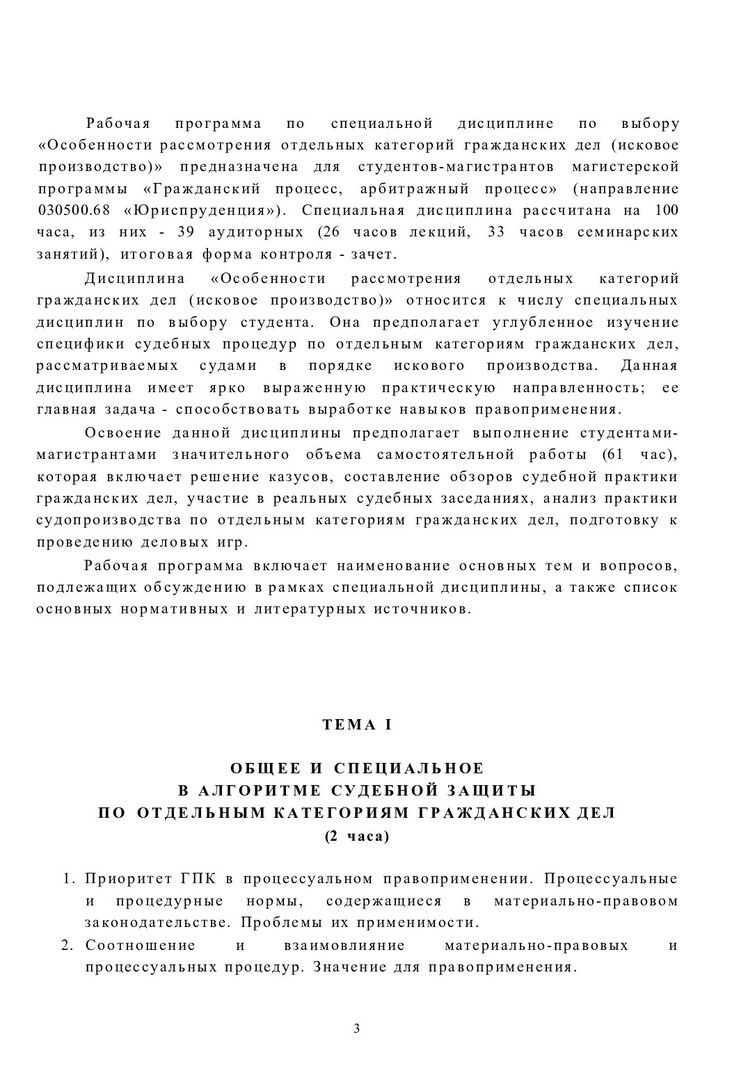 Особенности рассмотрения отдельных категорий гражданских дел : рабочая программа по спец. дисциплине (магистерская программа "Гражданский процесс, арбитражный процесс")