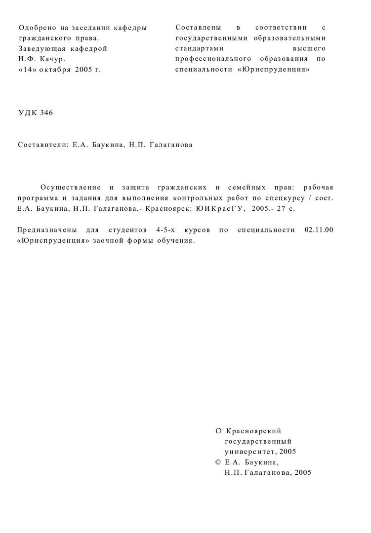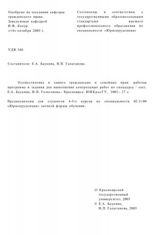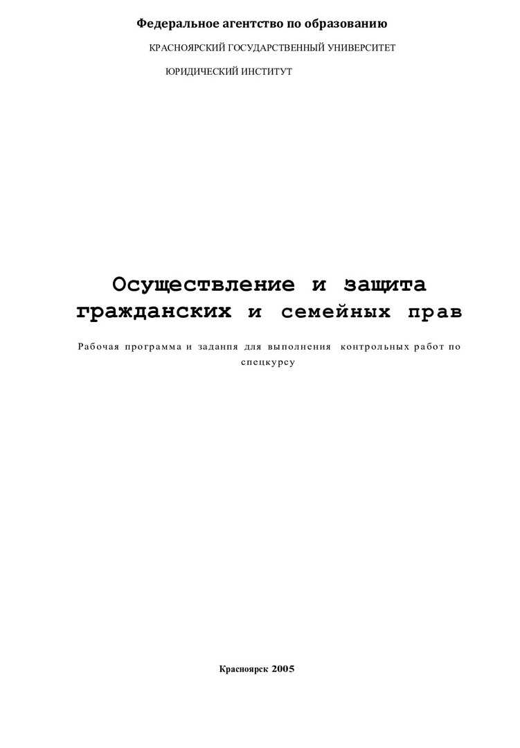 Библиографическое описание:Осуществление и защита гражданских и семейных прав : рабочая программа и задания для выполнения контрол. работ по спецкурсу / Краснояр. гос. ун-т. Юрид. ин-т ; сост.: Н. П. Галаганова, Е. А. Баукина. - Электрон. текстовые дан. - Красноярск : ИЦ КрасГУ, 2005. - (Электронная библиотека СФУ). - Загл. с титул. экрана. - Текст : электронный.