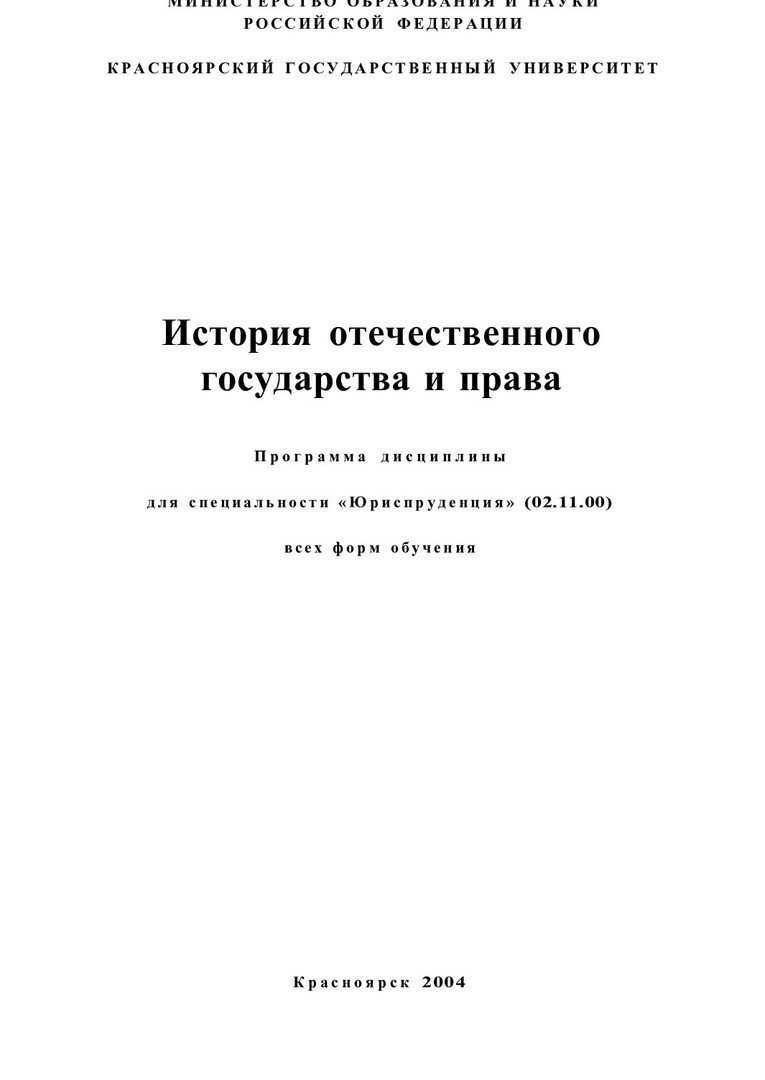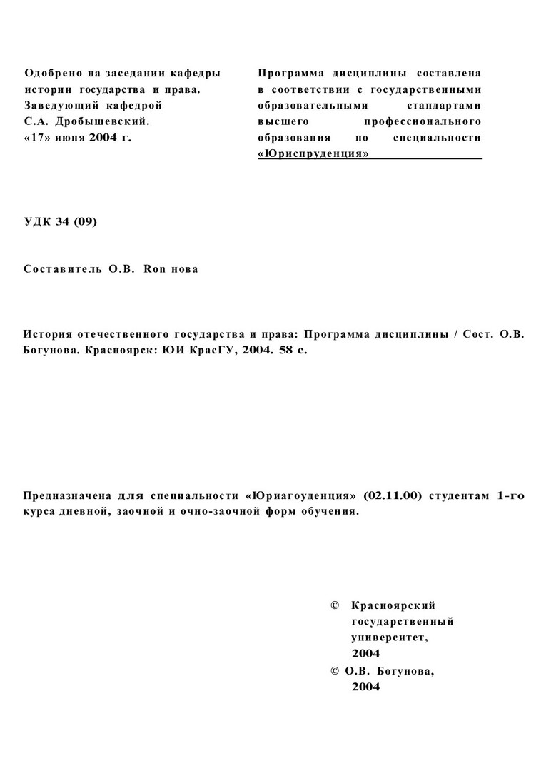 Библиографическое описание:История отечественного государства и права : программа дисциплины для спец. "Юриспруденция" (02.11.00) всех форм обучения / Краснояр. гос. ун-т ; сост. О. В. Богунова. - Электрон. текстовые дан. - Красноярск : ИЦ КрасГУ, 2004. - (Электронная библиотека СФУ). - Загл. с титул. экрана. - Текст : электронный.
