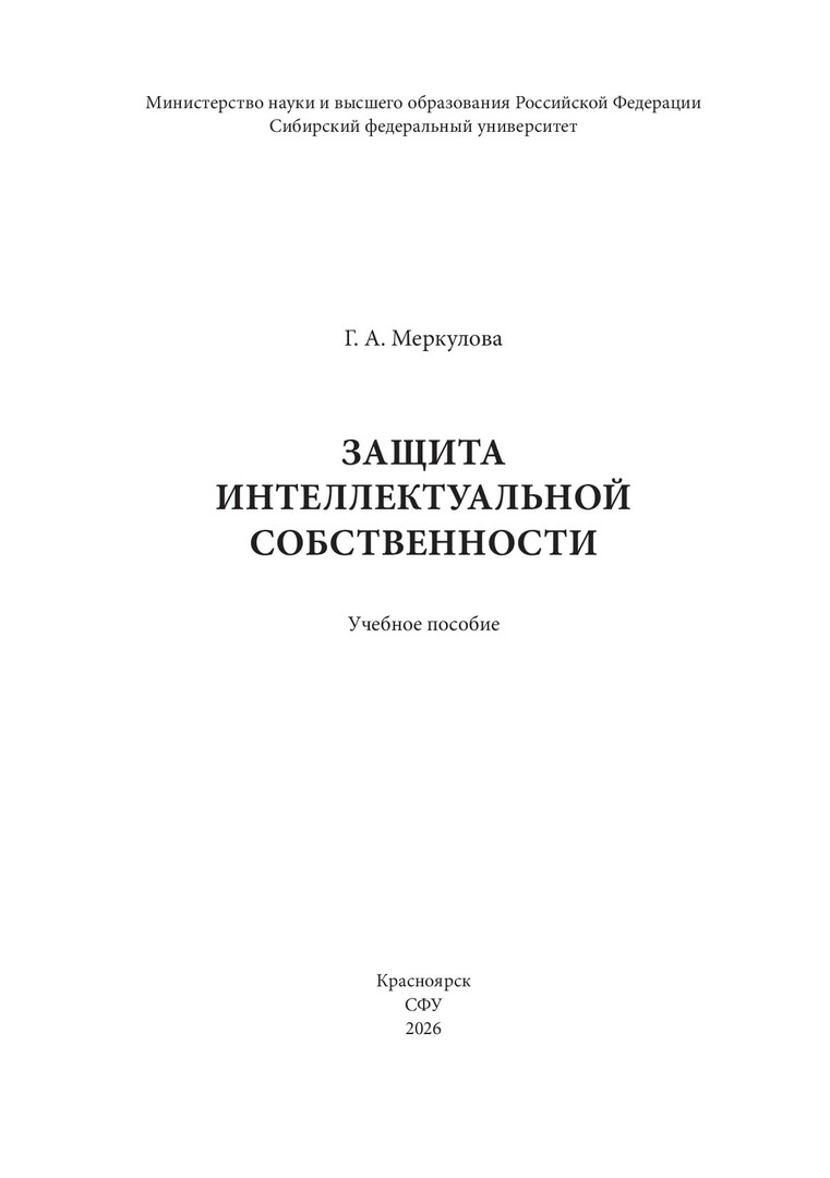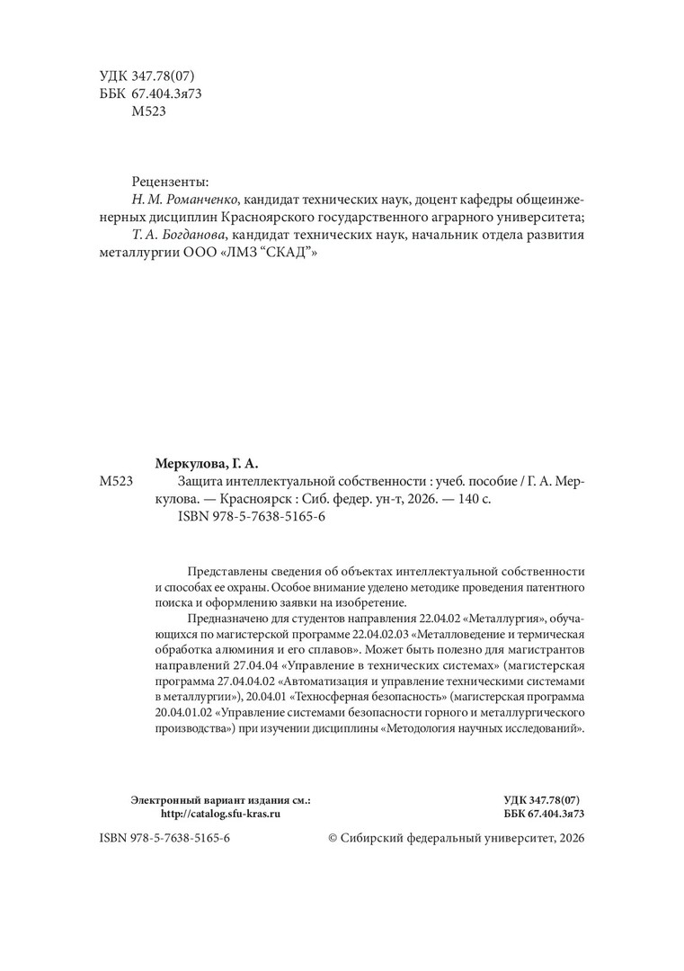 Библиографическое описание: Меркулова, Галина Александровна. Защита интеллектуальной собственности : учебное пособие / Г. А. Меркулова ; рец.: Н. М. Романченко, Т. А. Богданова ; Сибирский федеральный университет, Институт цветных металлов. - Электрон. текстовые дан. (pdf, 5.4 Мб). - Красноярск : СФУ, 2026 (2026-02-20). - 140 с., 8.8 усл. печ. л. : ил. - Загл. с титул. экрана. - Электрон. версия печ. публикации . - Библиогр.: с. 114-115. - 100 экз. - ISBN 978-5-7638-5165-6 : Б. ц. - Изд. № 2025-25193. - Текст : электронный.