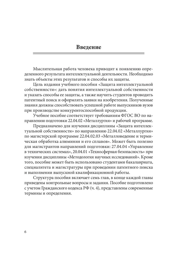 Аннотация: Представлены сведения об объектах интеллектуальной собственности и способах ее охраны. Особое внимание уделено методике проведения патентного поиска и оформлению заявки на изобретение. Предназначено для студентов направления 22.04.02 «Металлургия», обучающихся по магистерской программе 22.04.02.03 «Металловедение и термическая обработка алюминия и его сплавов». Может быть полезно для магистрантов направлений 27.04.04 «Управление в технических системах» (магистерская программа 27.04.04.02 «Автоматизация и управление техническими системами в металлургии»), 20.04.01 «Техносферная безопасность» (магистерская программа 20.04.01.02 «Управление системами безопасности горного и металлургического производства») при изучении дисциплины «Методология научных исследований».