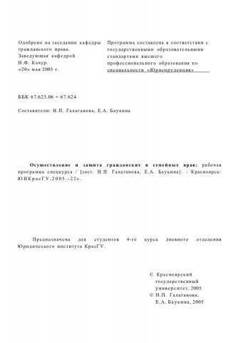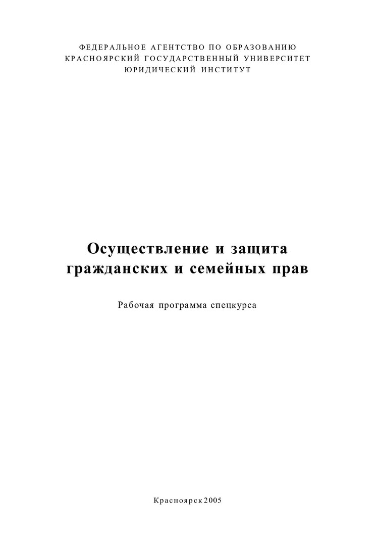Библиографическое описание:Осуществление и защита гражданских и семейных прав : рабочая программа спецкурса / Краснояр. гос. ун-т. Юрид. ин-т ; сост.: Н. П. Галаганова, Е. А. Баукина. - Электрон. текстовые дан. - Красноярск : ИЦ КрасГУ, 2005. - (Электронная библиотека СФУ). - Загл. с титул. экрана. - Текст : электронный.