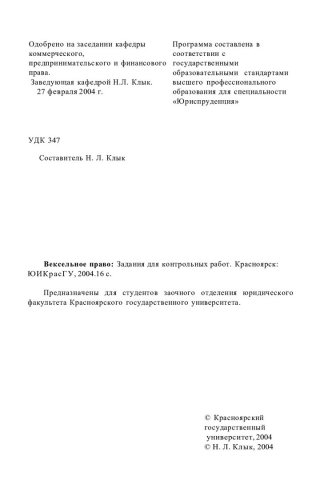 Библиографическое описание:Вексельное право : задания для контр. работ / Краснояр. гос. ун-т. Юрид. ин-т ; сост. Н. Л. Клык. - Электрон. текстовые дан. - Красноярск : ИЦ КрасГУ, 2004. - (Электронная библиотека СФУ). - Загл. с титул. экрана. - Текст : электронный.