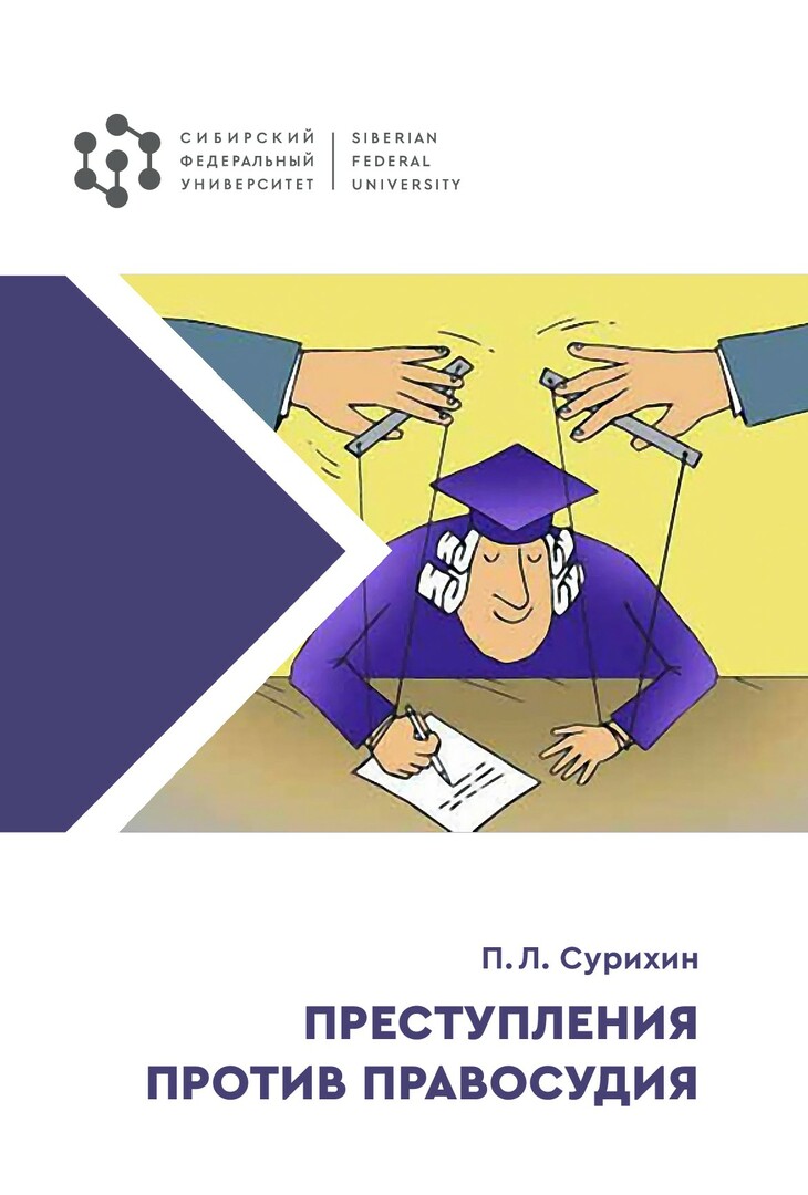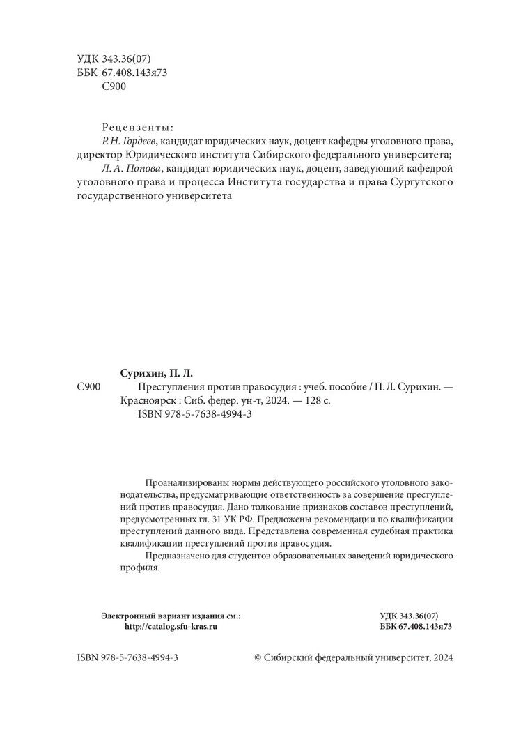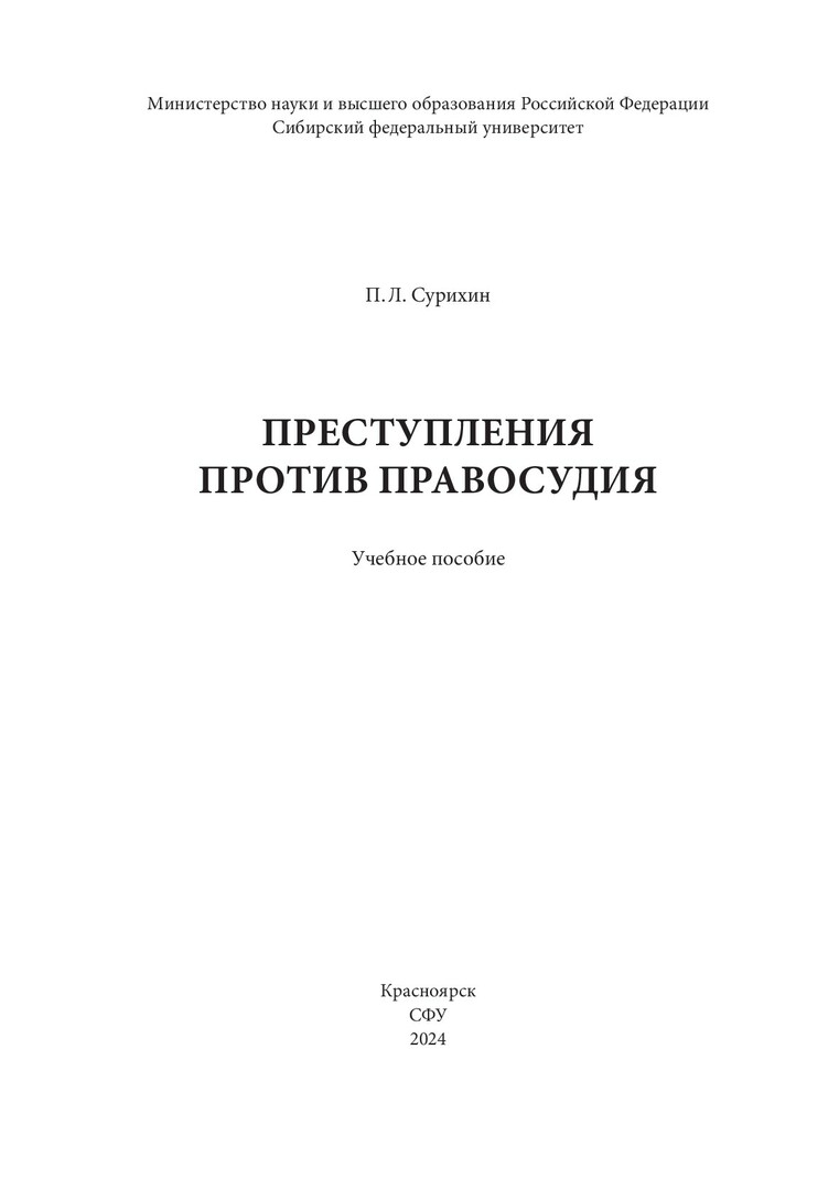Библиографическое описание: Сурихин, Петр Леонидович. Преступления против правосудия : учебное пособие / П. Л. Сурихин ; рец.: Р. Н. Гордеев, Л. А. Попова ; Сибирский федеральный университет, Юридический институт. - Электрон. текстовые дан. (1,3 Мб). - Красноярск : СФУ, 2024 (2024-11-08). - 128 с., 8.0 усл. печ. л. - Загл. с титул. экрана. - Электрон. версия печ. публикации . - Библиогр.: с. 125. - 100 экз. - ISBN 978-5-7638-4994-3 : Б. ц. - Изд. № 2024-21385. - Текст : электронный.