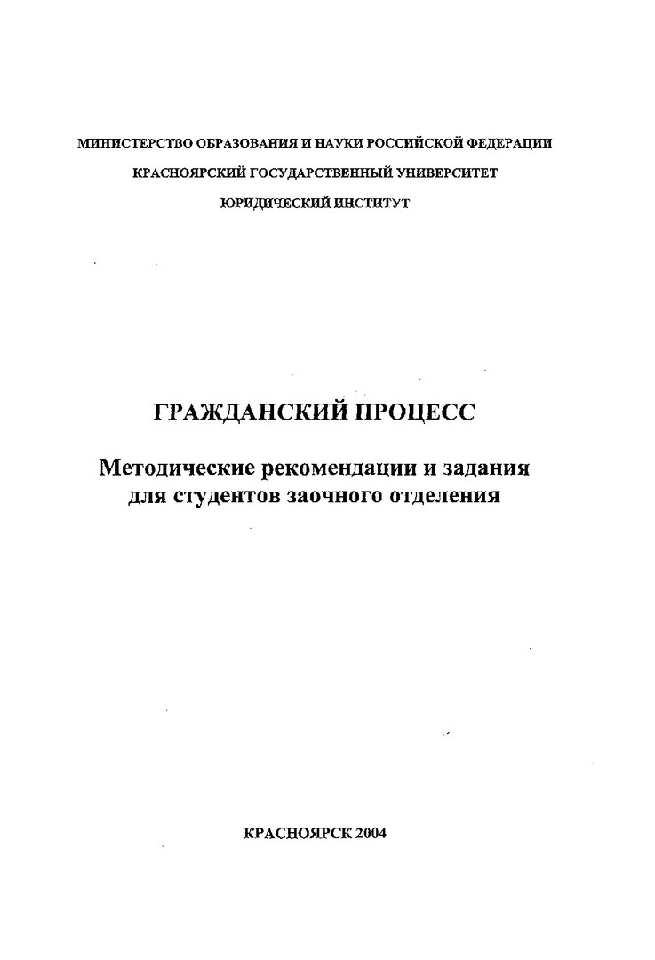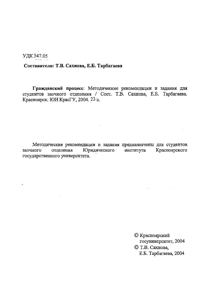 Библиографическое описание:Гражданский процесс : метод. рекомендации и задания для студентов заочного отделения / Краснояр. гос. ун-т. Юрид. ин-т ; сост.: Т. В. Сахнова, Е. Б. Тарбагаева. - Электрон. текстовые дан. - Красноярск : ИЦ КрасГУ, 2004. - (Электронная библиотека СФУ). - Загл. с титул. экрана. - Б. ц. - Текст : непосредственный.