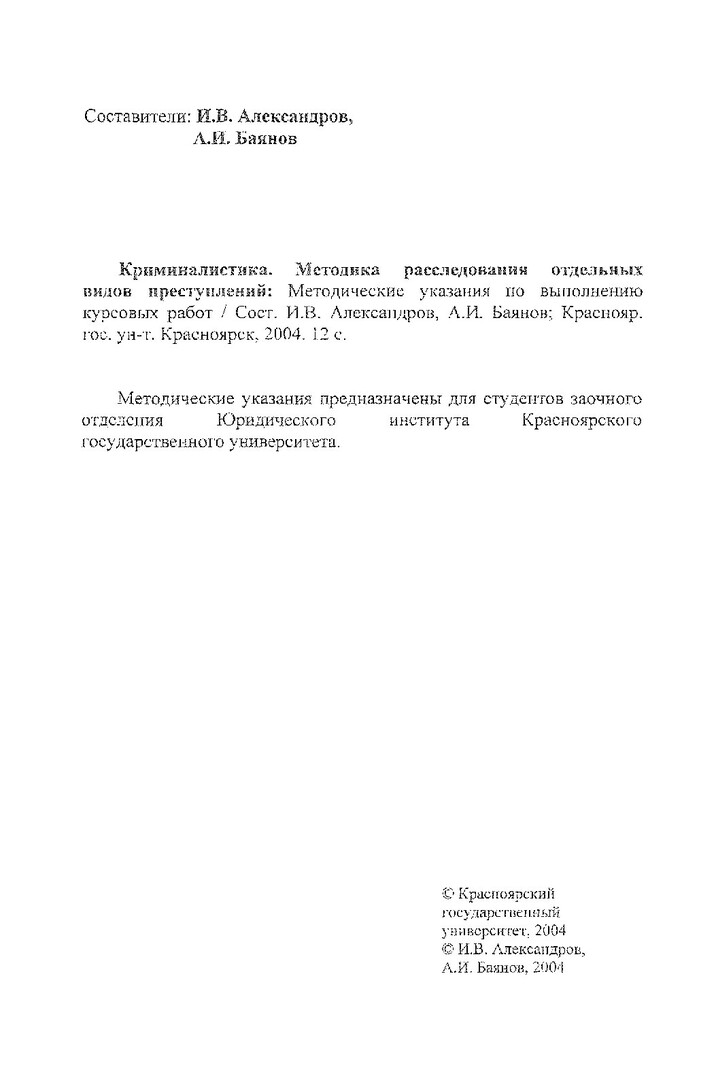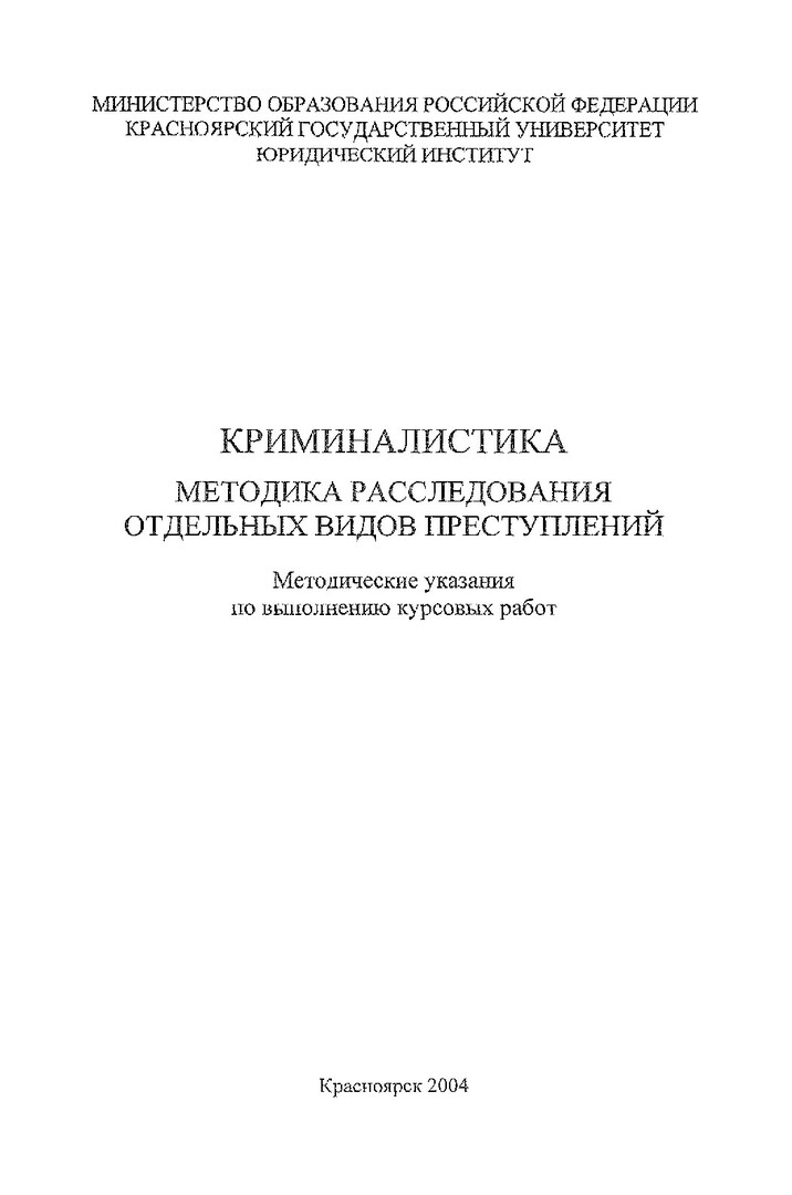 Библиографическое описание:Криминалистика. Методика расследования отдельных видов преступлений : метод. указ. по выполнению курсовых работ / Краснояр. гос. ун-т. Юрид. ин-т ; сост.: И. В. Александров, А. И. Баянов. - Электрон. текстовые дан. - Красноярск : ИЦ КрасГУ, 2004. - (Электронная библиотека СФУ). - Загл. с титул. экрана. - Б. ц. - Текст : непосредственный.