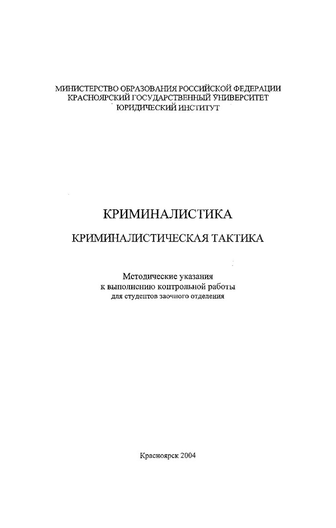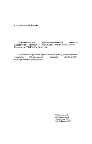 Криминалистика. Криминалистическая тактика : метод. указ. к выполнению контр. работы для студентов заоч. отд-ния / Краснояр. гос. ун-т. Юрид. ин-т ; сост. Баянов. - Электрон. текстовые дан. - Красноярск : ИЦ КрасГУ, 2004. - (Электронная библиотека СФУ). - Загл. с титул. экрана. - Текст : непосредственный.