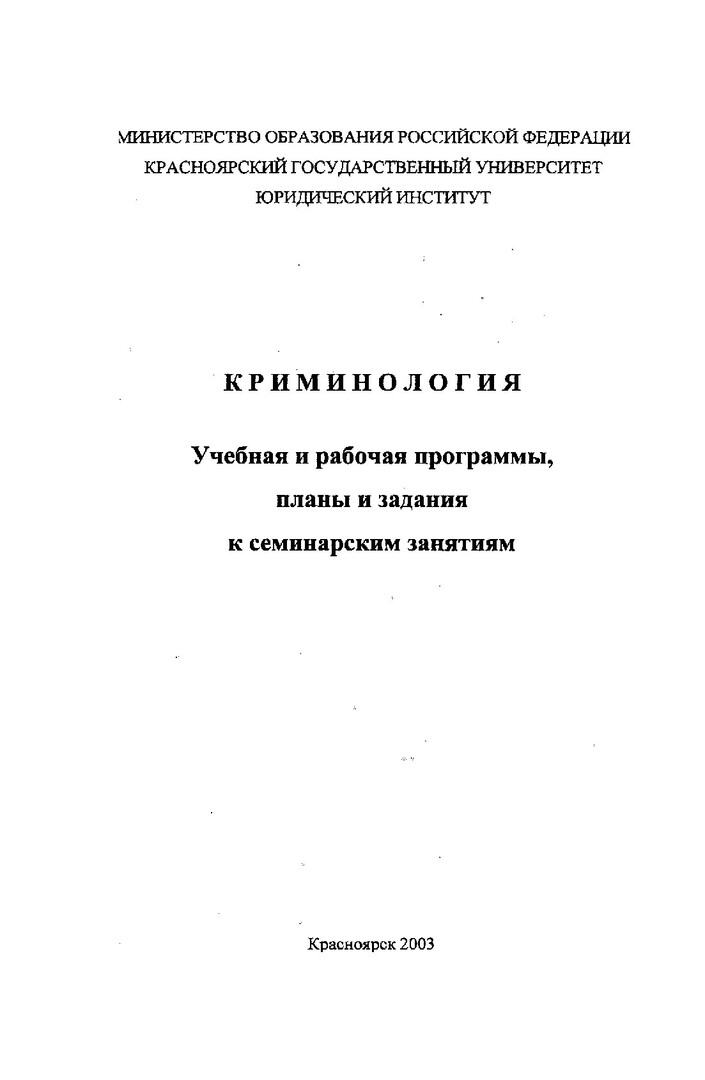 Библиографическое описание:Криминология : учеб. и рабочая программы, планы и задания к семинар. занятиям / Краснояр. гос. ун-т. Юрид. ин-т ; сост.: Н. В. Щедрин, А. В. Усс. - Электрон. текстовые дан. - Красноярск : ИЦ КрасГУ, 2003. - (Электронная библиотека СФУ). - Загл. с титул. экрана. - Текст : электронный.