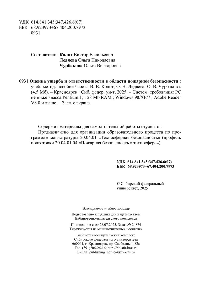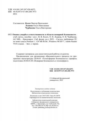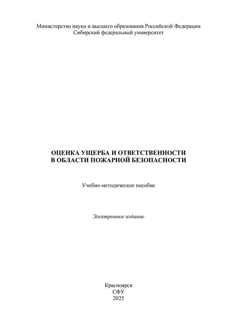 Библиографическое описание:Оценка ущерба и ответственности в области пожарной безопасности : учебно-методическое пособие / Сибирский федеральный университет, Политехнический институт ; сост.: В. В. Колот, О. Н. Ледяева, О. В. Чурбакова. - Электрон. текстовые дан. (pdf, 4.3 Мб). - Красноярск : СФУ, 2025 (2025-07-28). - 77 с. - Загл. с титул. экрана. - Библиогр.: с. 76-77. - Изд. № 2025-24874 : Б. ц. - Текст : электронный.