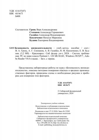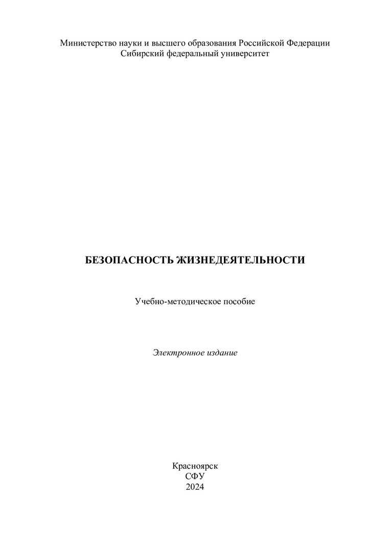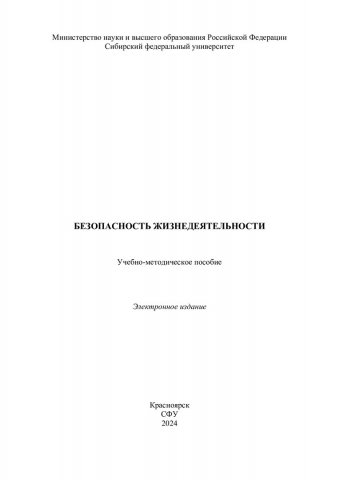Библиографическое описание: Безопасность жизнедеятельности : учебно-методическое пособие / Сибирский федеральный университет, Институт цветных металлов ; сост. В. А. Гронь, А. Г. Степанов, А. В. Галайко [и др.]. - Электрон. текстовые дан. (pdf, 3,1 Мб). - Красноярск : СФУ, 2024 (2024-12-27). - 75 с. : ил., табл. - Загл. с титул. экрана. - Библиогр.: с. 75. - Изд. № 2024-23282 : Б. ц. - Текст : электронный.