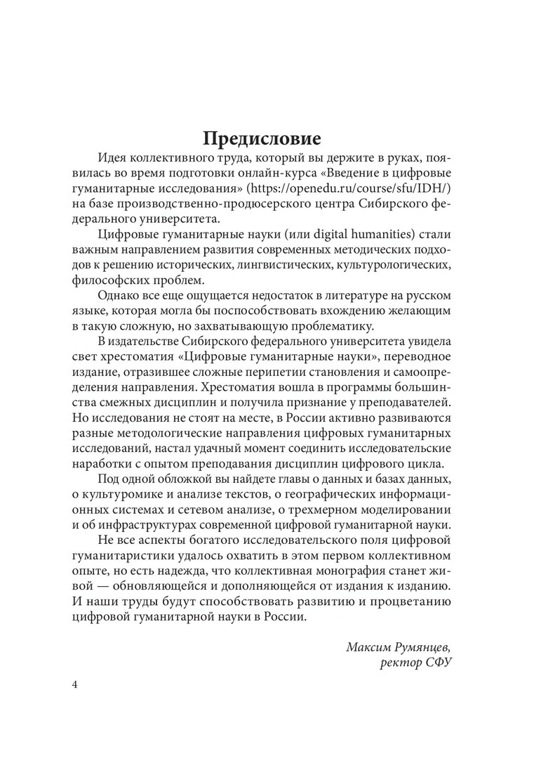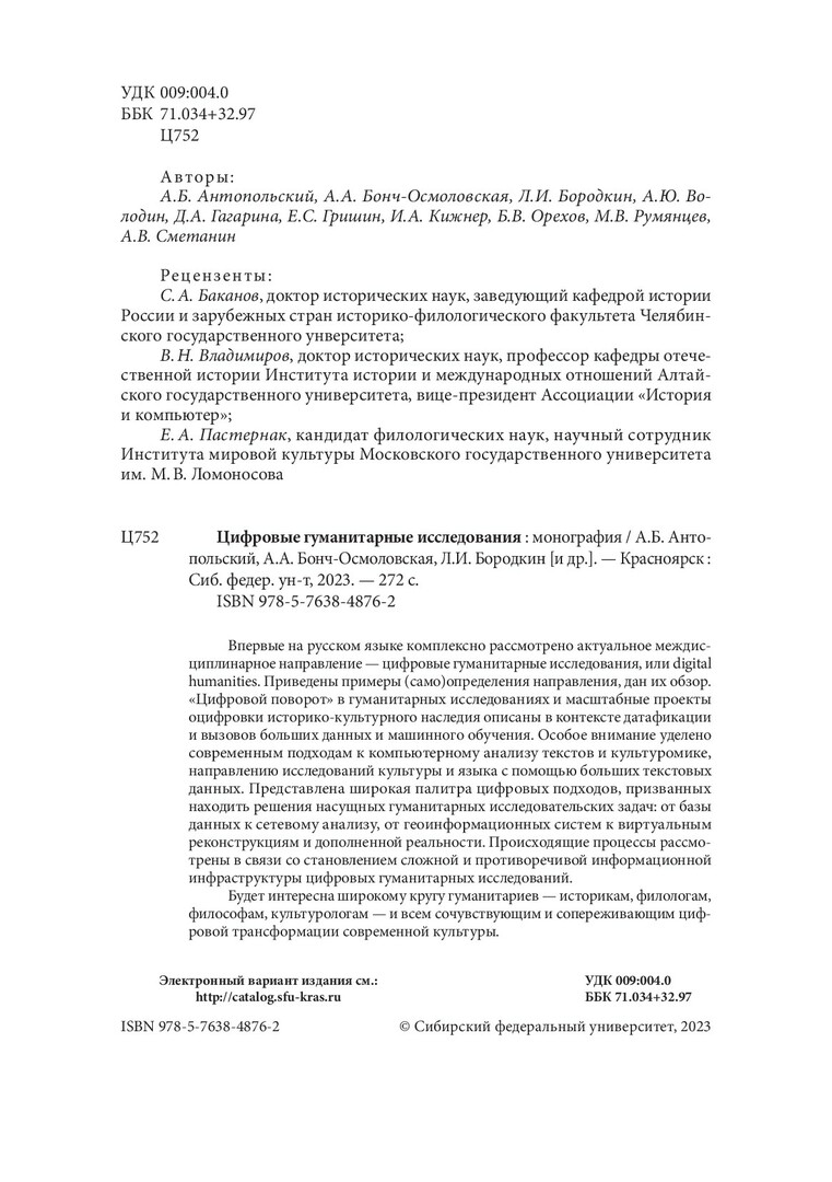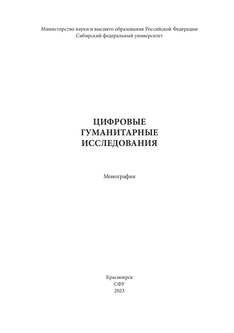 Библиографическое описание: Цифровые гуманитарные исследования : монография / [А. Б. Антопольский, А. А. Бонч-Осмоловская, Л. И. Бородкин [и др.] ; [рец. С. А. Баканов] ; Сибирский федеральный университет. - Красноярск : СФУ, 2023 (2023-09-20). - 272 с., 17.0 усл. печ. л. : 7 л. цв. ил., цв. граф., табл., цв. ил. - 500 экз. - ISBN 978-5-7638-4876-2 : 252.96 р. - Изд. № 2023-19926. - Текст : непосредственный + Текст : электронный.