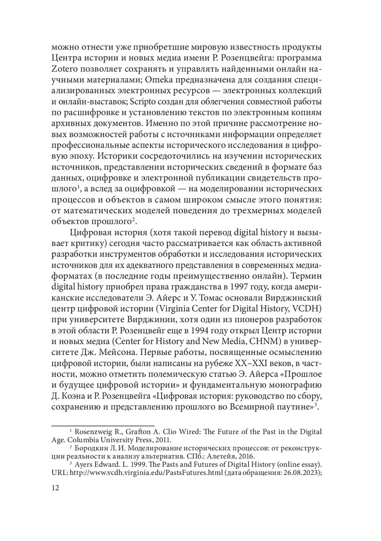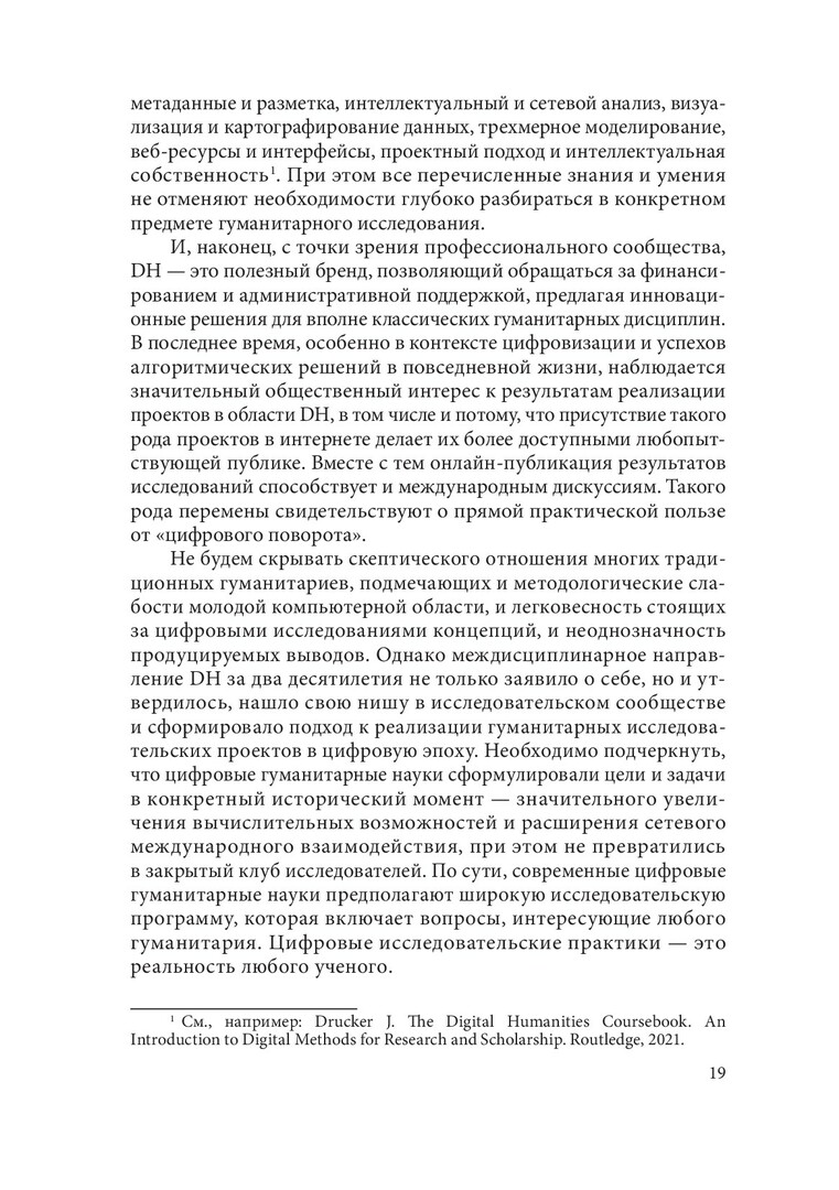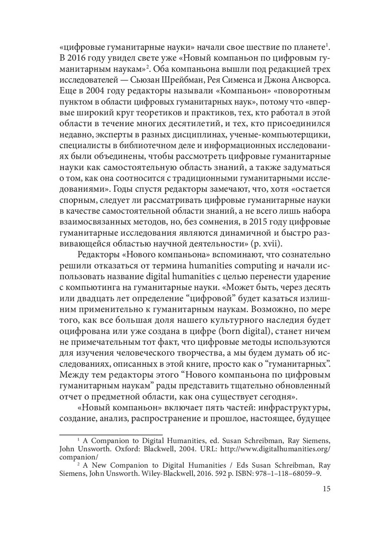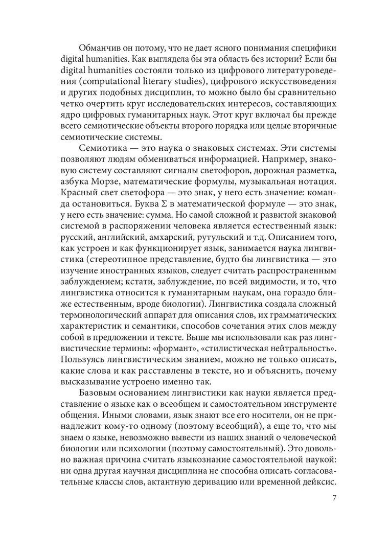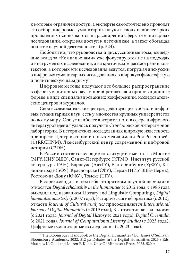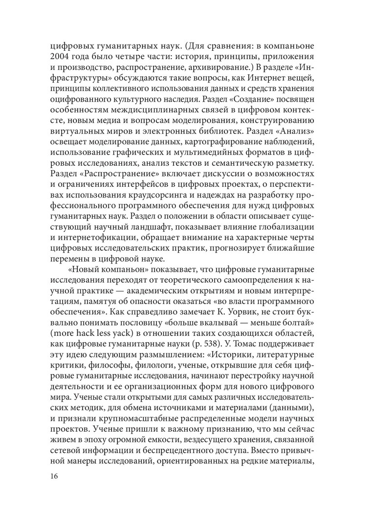 Аннотация: Впервые на русском языке комплексно рассмотрено актуальное междисциплинарное направление - цифровые гуманитарные исследования, или digital humanities. Приведены примеры (само)определения направления, дан их обзор. «Цифровой поворот» в гуманитарных исследованиях и масштабные проекты оцифровки историко-культурного наследия описаны в контексте датафикации и вызовов больших данных и машинного обучения. Особое внимание уделено современным подходам к компьютерному анализу текстов и культуромике, направлению исследований культуры и языка с помощью больших текстовых данных. Представлена широкая палитра цифровых подходов, призванных находить решения насущных гуманитарных исследовательских задач: от базы данных к сетевому анализу, от геоинформационных систем к виртуальным реконструкциям и дополненной реальности. Происходящие процессы рассмотрены в связи со становлением сложной и противоречивой информационной инфраструктуры цифровых гуманитарных исследований. Будет интересна широкому кругу гуманитариев - историкам, филологам, философам, культурологам - и всем сочувствующим и сопереживающим цифровой трансформации современной культуры.