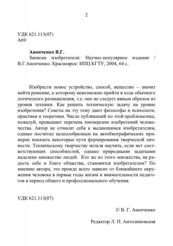 Библиографическое описание: Анопченко, Виктор Григорьевич. Записки изобретателя / В. Г. Анопченко. - Красноярск : ИПЦ КГТУ, 2004. - 64 с. - 50.00 р. - Текст : непосредственный + Текст : электронный.