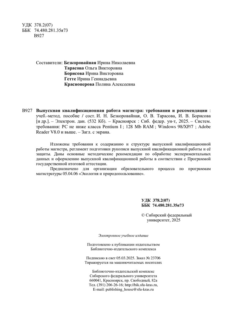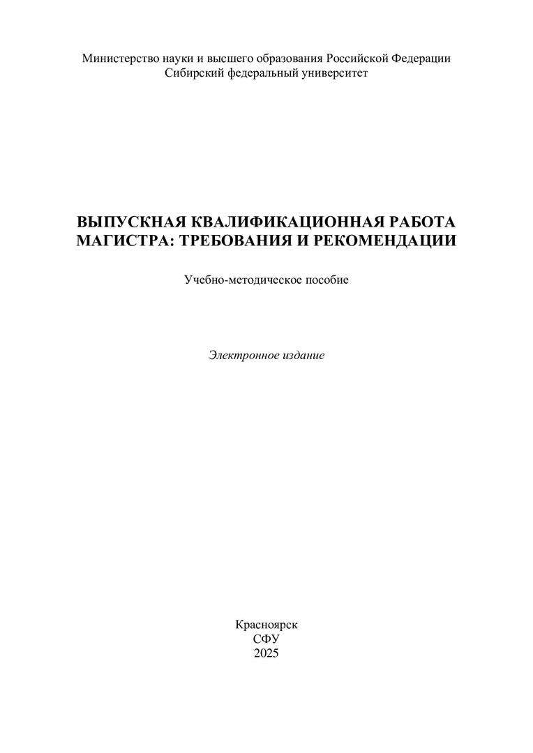 Библиографическое описание: Выпускная квалификационная работа магистра: требования и рекомендации : учебно-методическое пособие / Сибирский федеральный университет, Институт экологии и географии ; сост.: И. Н. Безкоровайная, О. В. Тарасова, И. В. Борисова [и др.]. - Электрон. текстовые дан. (pdf, 0,6 Мб). - Красноярск : СФУ, 2025 (2025-03-05). - 22 с. - Загл. с титул. экрана. - Изд. № 2025-23706 : Б. ц. - Текст : электронный.