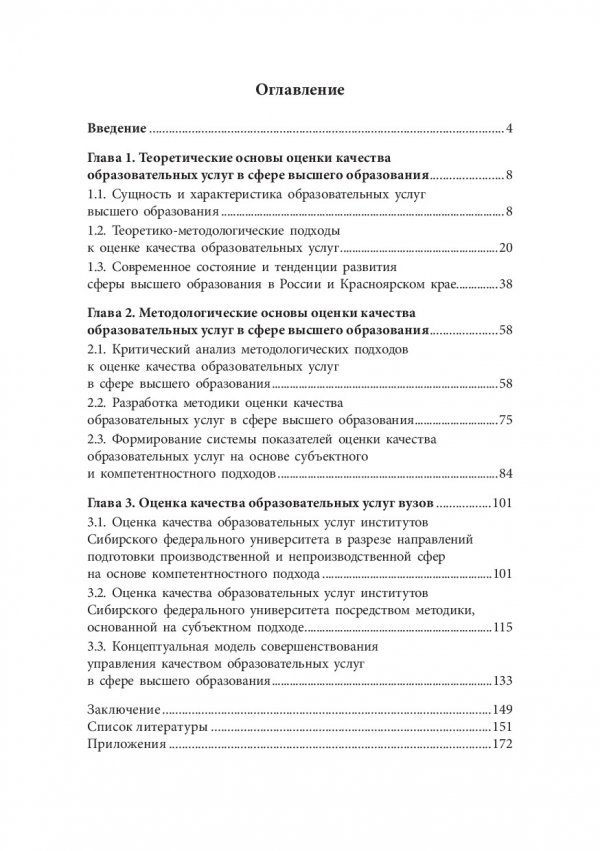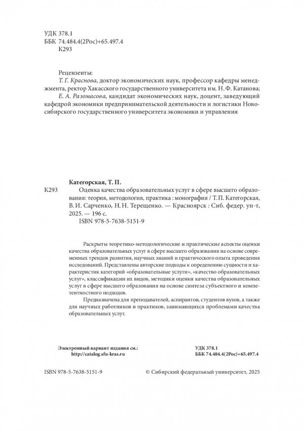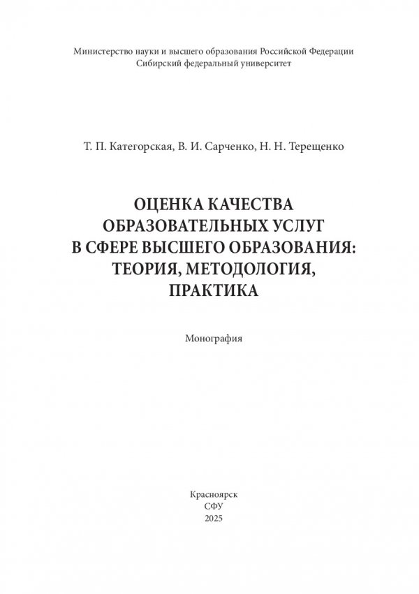 Библиографическое описание: Категорская, Татьяна Петровна. Оценка качества образовательных услуг в сфере высшего образования: теория, методология, практика : монография / Т. П. Категорская, В. И. Сарченко, Н. Н. Терещенко ; рец.: Т. Г. Краснова, Е. А. Разомасова ; Сибирский федеральный университет. - Электрон. текстовые дан. (pdf, 13.5 Мб). - Красноярск : СФУ, 2025 (2025-11-20). - 196 с., 12.3 усл. печ. л. : табл., схемы, граф. - Загл. с титул. экрана. - Электрон. версия печ. публикации . - Библиогр.: с. 151-171. - 500 экз. - ISBN 978-5-7638-5151-9 : Б. ц. - Изд. № 2025-24956. - Текст : электронный.