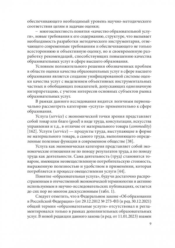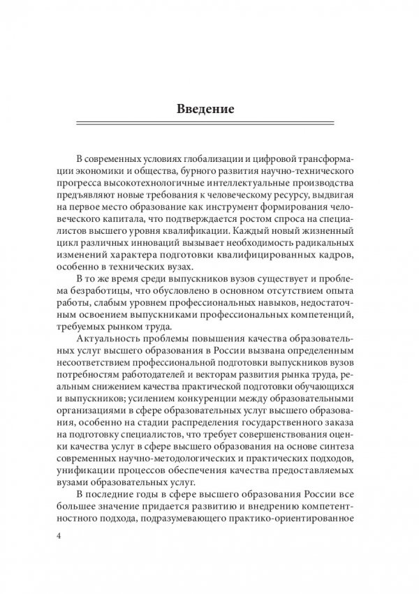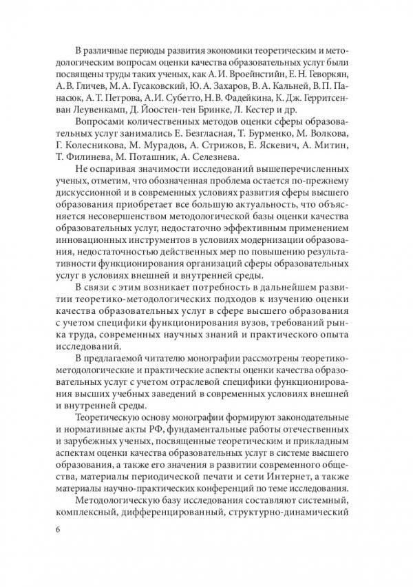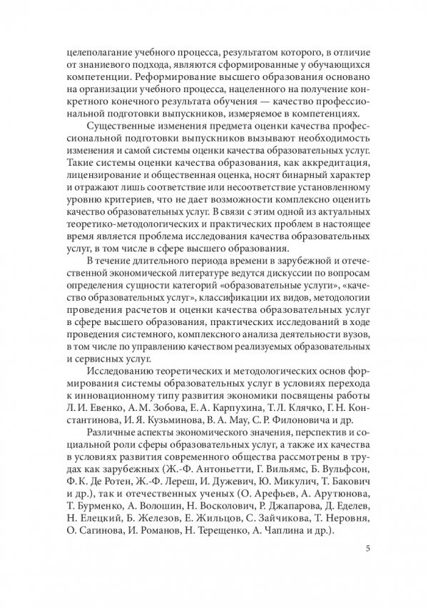 Аннотация: Раскрыты теоретико-методологические и практические аспекты оценки качества образовательных услуг в сфере высшего образования на основе современных трендов развития, научных знаний и практического опыта проведения исследований. Представлены авторские подходы к определению сущности и характеристик категорий «образовательные услуги», «качество образовательных услуг», классификации их видов, методики оценки качества образовательных услуг в сфере высшего образования на основе синтеза субъектного и компетентностного подходов. Предназначена для преподавателей, аспирантов, студентов вузов, а также для научных работников и практиков, занимающихся проблемами качества образовательных услуг.