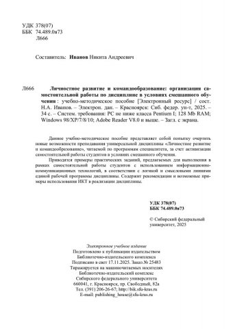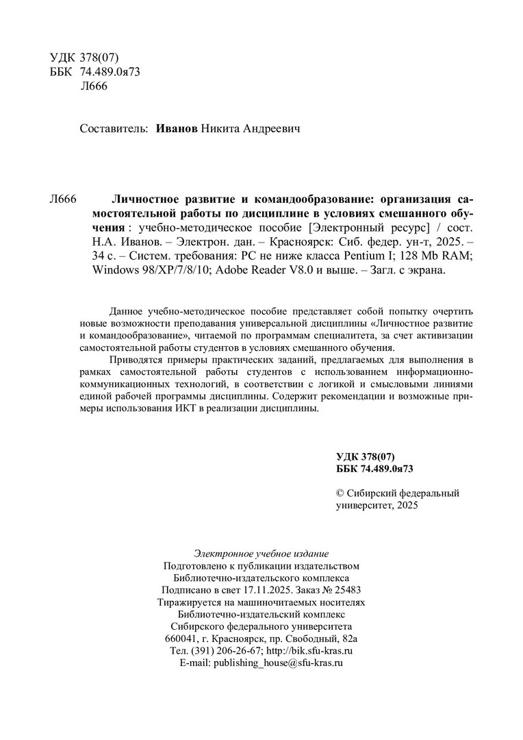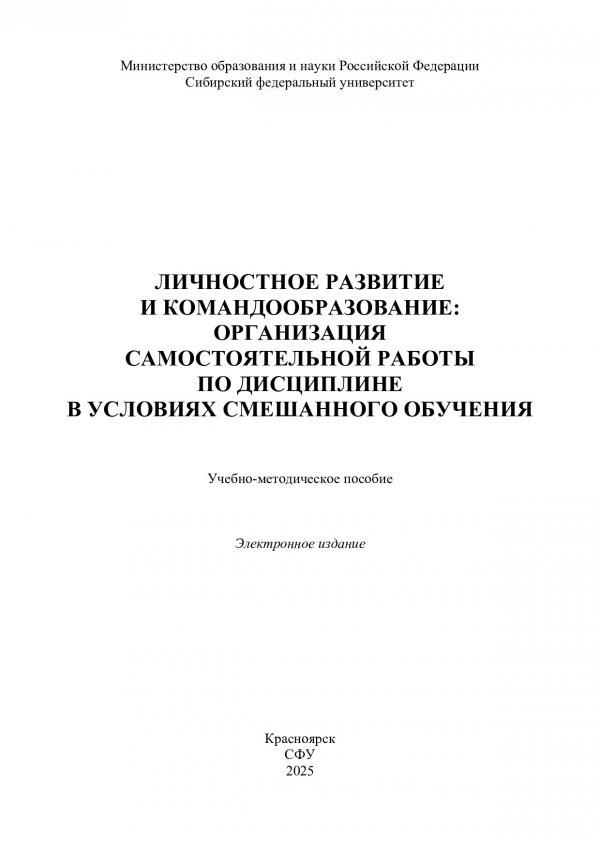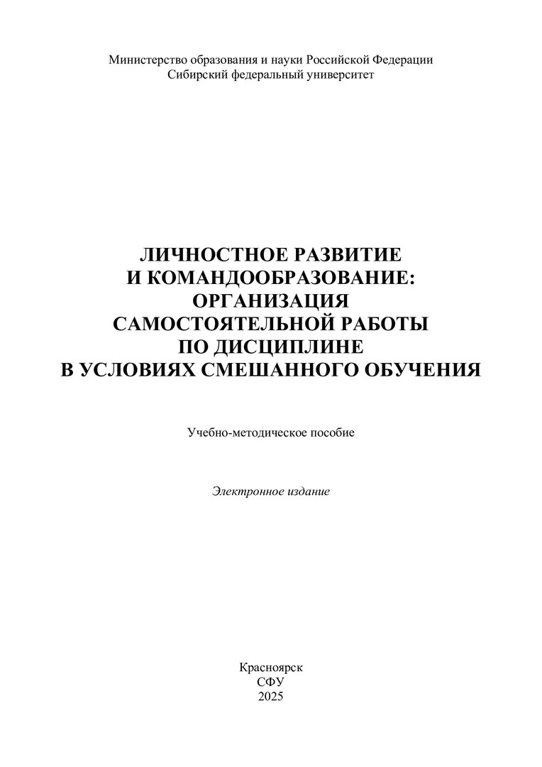 Библиографическое описание:Личностное развитие и командообразование: организация самостоятельной работы по дисциплине в условиях смешанного обучения : учебно-методическое пособие / Сибирский федеральный университет, Институт педагогики, психологии и социологии ; сост. Н. А. Иванов. - Электрон. текстовые дан. (pdf, 0.7 Мб). - Красноярск : СФУ, 2025. - 34 с. - Загл. с титул. экрана. - Изд. № 2025-25483 : Б. ц. - Текст : электронный.