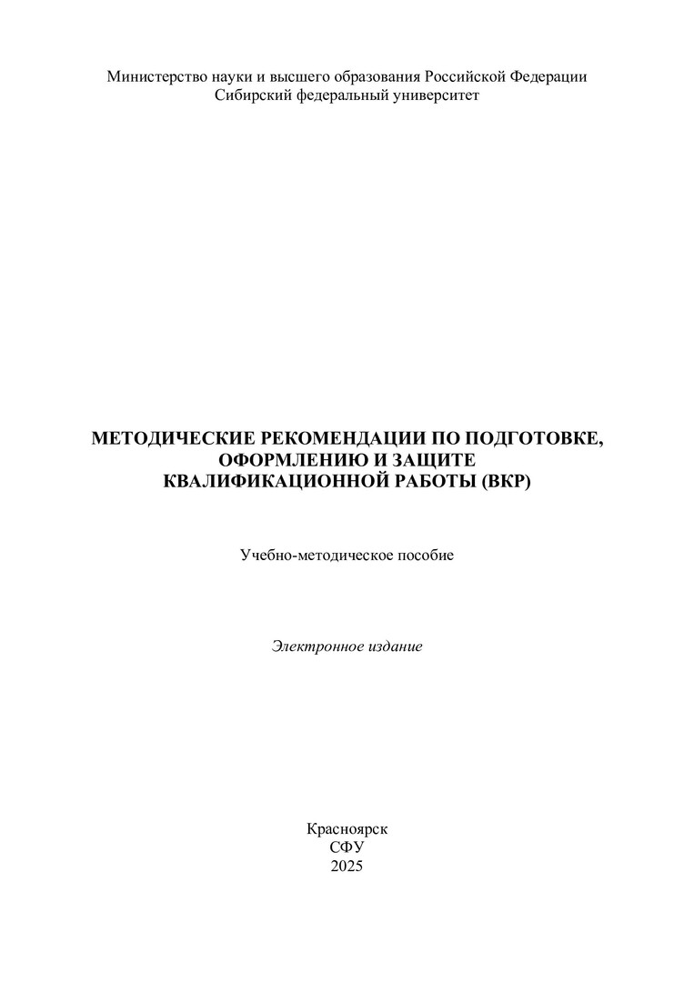 Библиографическое описание: Методические рекомендации по подготовке, оформлению и защите квалификационной работы (ВКР) : учебно-методическое пособие / Сибирский федеральный университет, Институт архитектуры и дизайна ; сост.: Т. К. Симанженкова, Н. М. Зимина, Т. Ю. Серикова. - Электрон. текстовые дан. (pdf, 4 Мб). - Красноярск : СФУ, 2025 (2025-05-12). - 52 с. - Загл. с титул. экрана. - Изд. № 2025-24410 : Б. ц. - Текст : электронный.