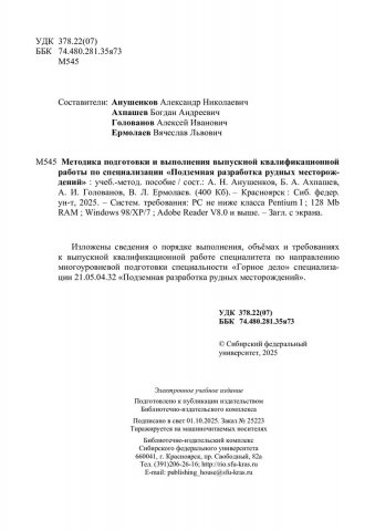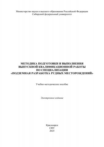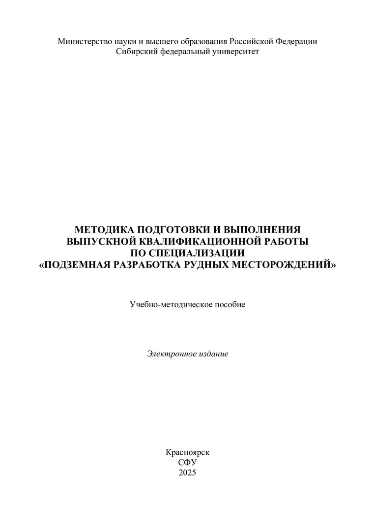 Библиографическое описание:Методика подготовки и выполнения выпускной квалификационной работы по специализации "Подземная разработка рудных месторождений" : учебно-методическое пособие / Сибирский федеральный университет, Институт цветных металлов ; сост.: А. Н. Анушенков, Б. А. Ахпашев, А. И. Голованов, В. Л. Ермолаев. - Электрон. текстовые дан. (pdf, 2.5 Мб). - Красноярск : СФУ, 2025 (2025-10-01). - 38 с. - Загл. с титул. экрана. - Библиогр.: с. 32-34. - Изд. № 2025-25223 : Б. ц. - Текст : электронный.