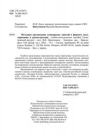 Библиографическое описание: Методики организации семинарских занятий в формате моделирования и реконструкции : учебно-методическое пособие / Сиб. федер. ун-т, Гуманитар. ин-т ; сост. В. В. Никуленков. - Электрон. текстовые дан. (pdf, 6 Мб). - Красноярск : СФУ, 2024 (2024-03-28). - 75 с. - Загл. с титул. экрана. - Изд. № 2024-21162 : Б. ц. - Текст : электронный.