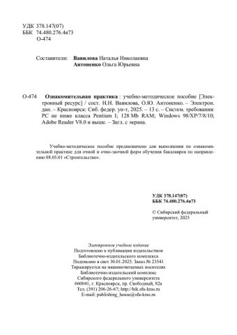 Библиографическое описание:Ознакомительная практика : учебно-методическое пособие / Сибирский федеральный университет, Инженерно-строительный институт ; сост.: Н. Н. Вавилова, О. Ю. Антоненко. - Электрон. текстовые дан. (pdf, 0,4 Мб). - Красноярск : СФУ, 2025. - 13 с. - Загл. с титул. экрана. - Изд. № 2024-23541 : Б. ц. - Текст : электронный.
