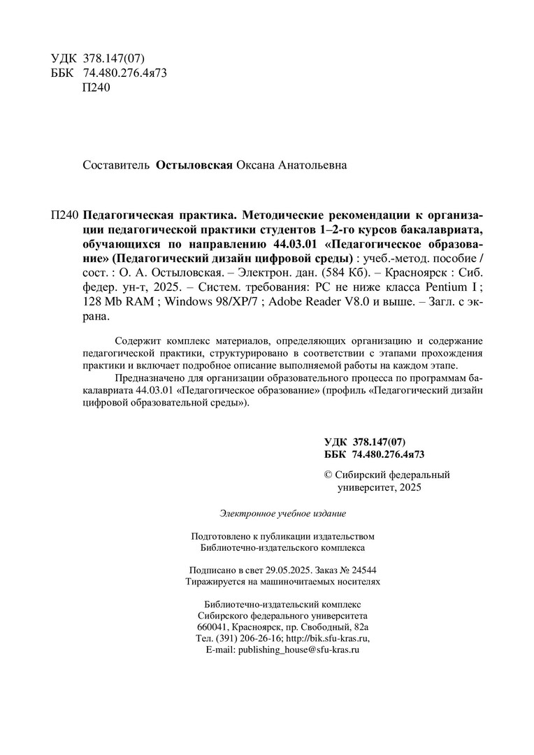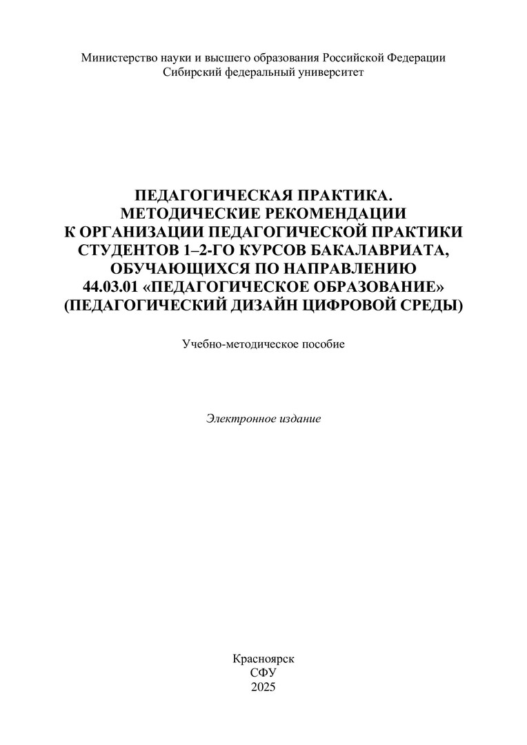 Библиографическое описание:Педагогическая практика. Методические рекомендации к организации педагогической практики студентов 1-2-го курсов бакалавриата, обучающихся по направлению 44.03.01 "Педагогическое образование" (Педагогический дизайн цифровой среды) : учебно-методическое пособие / Сиб. федер. ун-т, Ин-т педагогики, психологии и социологии ; сост. О. А. Остыловская. - Электрон. текстовые дан. (pdf, 0,7 Мб). - Красноярск : СФУ, 2025 (2025-05-29). - 28 с. - Загл. с титул. экрана. - Изд. № 2025-24544 : Б. ц. - Текст : электронный.
