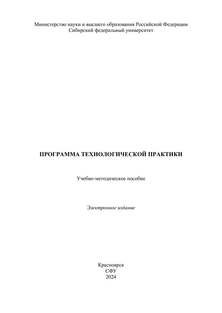 Библиографическое описание: Программа технологической практики : учебно-методическое пособие / сост. Р. М. Авдеев [и др.]. - Электрон. текстовые дан. (pdf, 1,1 Мб). - Красноярск : СФУ, 2024 (2024-05-17). - 18 с. - Загл. с титул. экрана. - Изд. № 2024-21853 : Б. ц. - Текст : электронный.