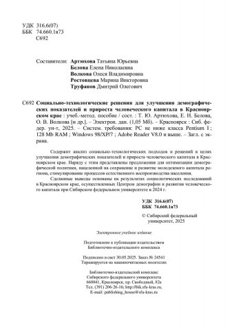 Библиографическое описание: Социально-технологические решения для улучшения демографических показателей и прироста человеческого капитала в Красноярском крае : учебно-методическое пособие / Сибирский федеральный университет, Институт педагогики, психологии и социологии ; сост. :Т. Ю. Артюхова, Е. Н. Белова, О. В. Волкова [и др.]. - Электрон. текстовые дан. (pdf, 1,1 Мб). - Красноярск : СФУ, 2025 (2025-05-30). - 73 с. - Загл. с титул. экрана. - Изд. № 2025-24541 : Б. ц. - Текст : электронный.