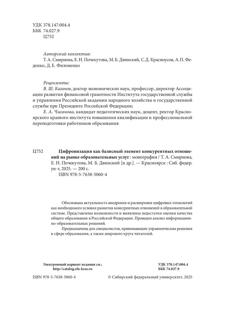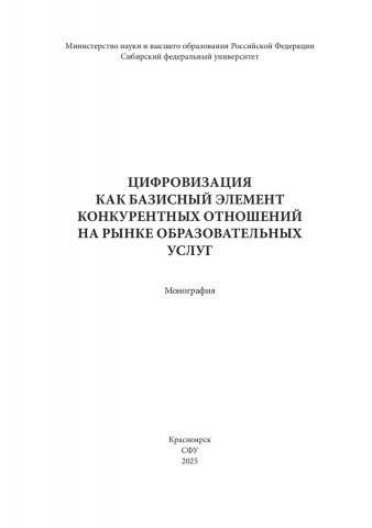 Библиографическое описание: Цифровизация как базисный элемент конкурентных отношений на рынке образовательных услуг : монография / Т. А. Смирнова, Е. Н. Почекутова, М. Б. Двинский [и др.] ; рец.: В. Ш. Каганов, Е. А. Чиганова ; Сибирский федеральный университет, Институт экономики, государственного управления и финансов. - Электрон. текстовые дан. (pdf, 5 Мб). - Красноярск : СФУ, 2025 (2025-08-08). - 200 с., 12.5 усл. печ. л. : цв. ил., граф., табл. - Загл. с титул. экрана. - Электрон. версия печ. публикации . - Библиогр.: с. 152-163. - 500 экз. - ISBN 978-5-7638-5060-4 : Б. ц. - Изд. № 2024-22912. - Текст : электронный.