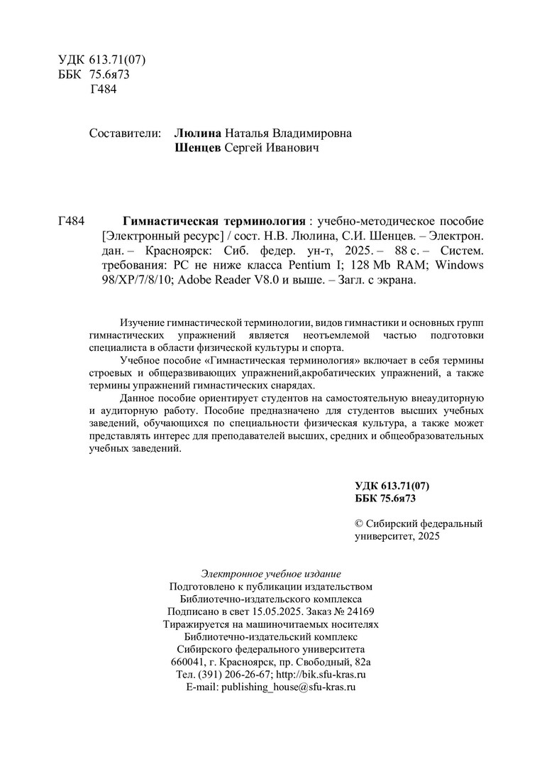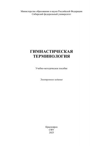 Библиографическое описание: Гимнастическая терминология : учебно-методическое пособие / Сибирский федеральный университет, Институт физической культуры, спорта и туризма ; сост.: Н. В. Люлина, С. И. Шенцев. - Электрон. текстовые дан. (pdf, 3,3 Мб). - Красноярск : СФУ, 2025. - 88 с. : ил. - Загл. с титул. экрана. - Библиогр.: с. 87-88. - Изд. № 2025-24169 : Б. ц. - Текст : электронный.