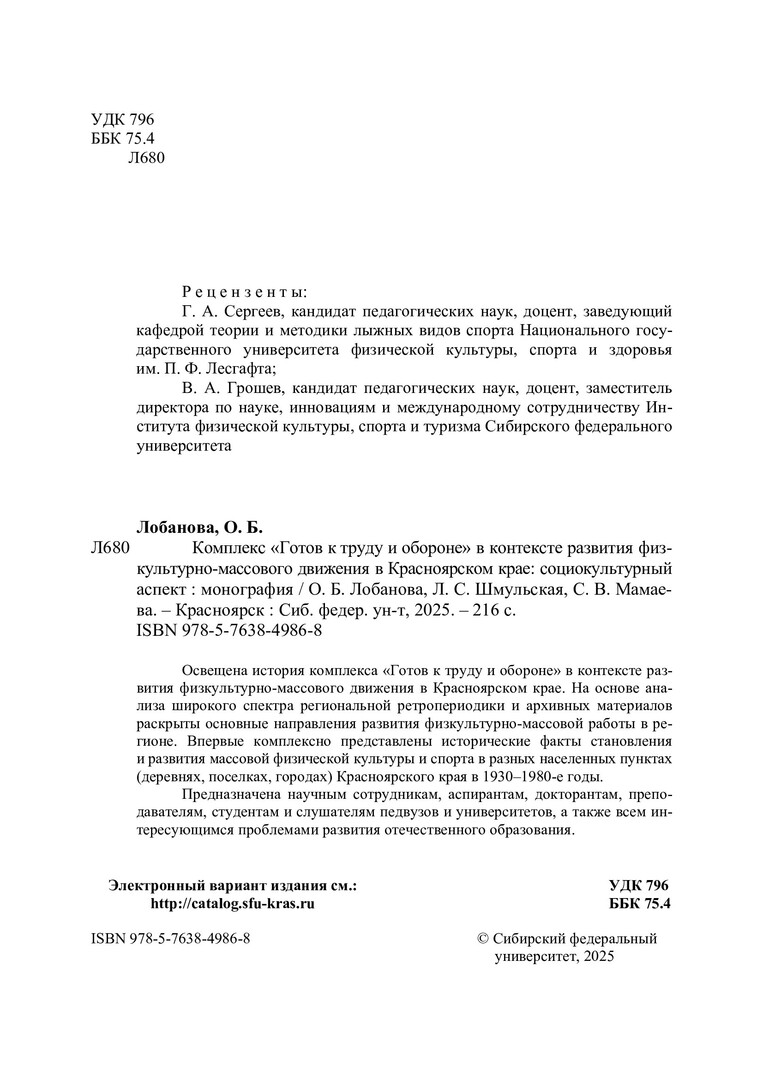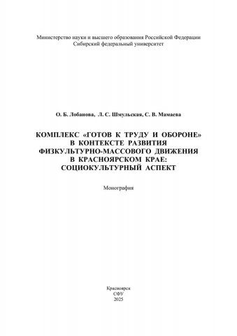 Библиографическое описание: Лобанова, Ольга Борисовна. Комплекс "Готов к труду и обороне" в контексте развития физкультурно-массового движения в Красноярском крае: социокультурный аспект : монография / О. Б. Лобанова, Л. С. Шмульская, С. В. Мамаева ; рец.: Г. А. Сергеев, В. А. Грошев ; Сибирский федеральный университет. - Электрон. текстовые дан. (pdf, 1.6 Мб). - Красноярск : СФУ, 2025 (2025-09-04). - 216 с., 13.5 усл. печ. л. : табл. - Загл. с титул. экрана. - Электрон. версия печ. публикации . - Библиогр.: с. 157-189. - 500 экз. - ISBN 978-5-7638-4986-8 : Б. ц. - Изд. № 2024-21900. - Текст : электронный.