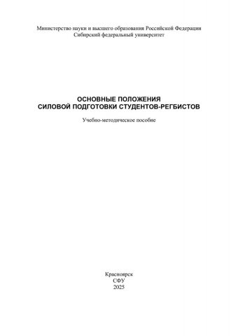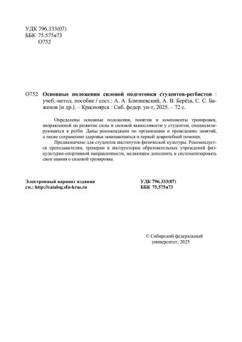 Библиографическое описание: Основные положения силовой подготовки студентов-регбистов : учебно-методическое пособие / Сибирский федеральный университет, Институт физической культуры, спорта и туризма ; сост. А. А. Близневский, А. В. Берёза, С. С. Баженов [и др.]. - Электрон. текстовые дан. (1,7 Мб). - Красноярск : СФУ, 2025 (2025-02-27). - 72 с., 2.0 усл. печ. л. - Загл. с титул. экрана. - Электрон. версия печ. публикации . - Библиогр.: с. 69-70. - 100 экз. - Изд. № 2025-23840 : Б. ц. - Текст : электронный.
