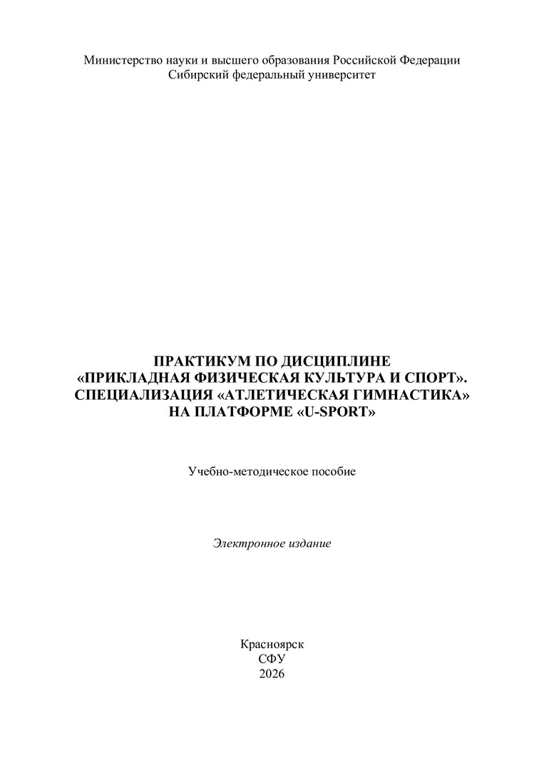 Библиографическое описание: Практикум по дисциплине "Прикладная физическая культура и спорт". Специализация "Атлетическая гимнастика" на платформе "U-Sport" : учебно-методическое пособие / Сибирский федеральный университет, Институт физической культуры, спорта и туризма ; сост.: Е. Н. Данилова, Л. Т. Сабинин, В. Н. Уланов. - Электрон. текстовые дан. (pdf, 2.5 Мб). - Красноярск : СФУ, 2026 (2026-01-22). - 87 с. - Загл. с титул. экрана. - Библиогр.: с. 29. - Изд. № 2026-25994 : Б. ц. - Текст : электронный.