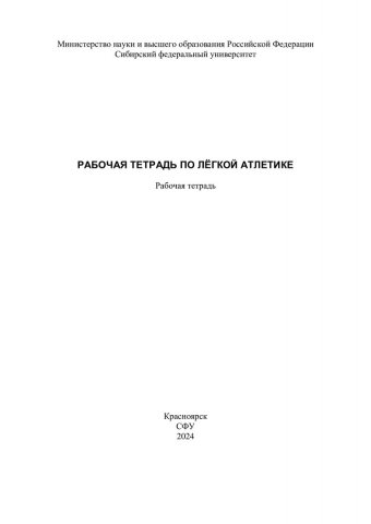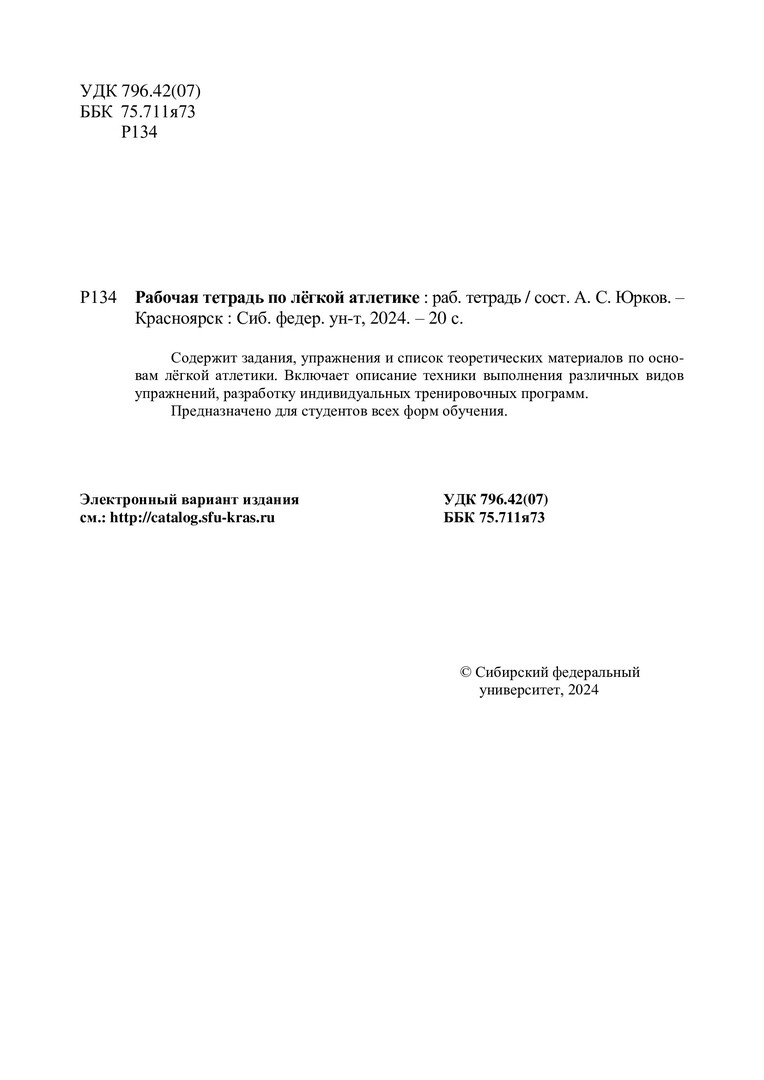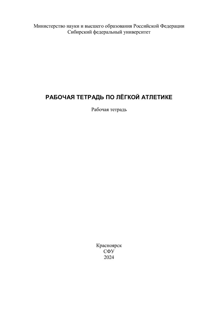 Библиографическое описание:Рабочая тетрадь по легкой атлетике / Сибирский федеральный университет, Институт физкультуры культуры, спорта и туризма ; сост. А. С. Юрков. - Электрон. текстовые дан. (0,7 Мб). - Красноярск : СФУ, 2024 (2024-09-26). - 20 с., 1.0 усл. печ. л. - Загл. с титул. экрана. - Электрон. версия печ. публикации . - Библиогр.: с. 17. - 100 экз. - Изд. № 2024-22758 : Б. ц. - Текст : электронный.