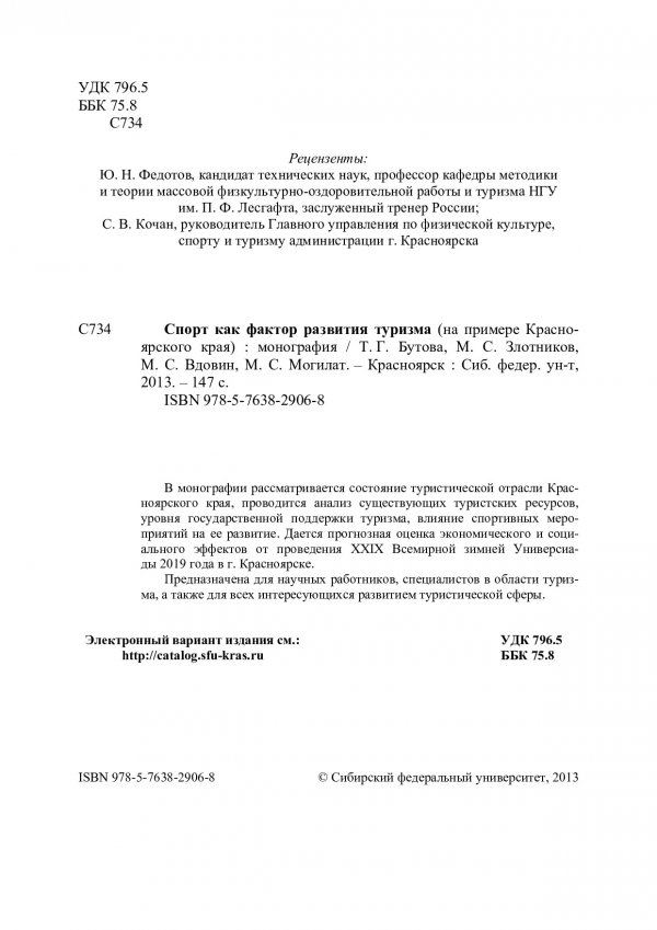 Библиографическое описание: Спорт как фактор развития туризма (на примере Красноярского края) : монография / Т. Г. Бутова, М. С. Злотников [и др.] ; Сиб. федер. ун-т, Ин-т физ. культуры, спорта и туризма. - Красноярск : СФУ, 2013. - 146 с. : граф., табл. - Библиогр.: с. 139-146. - 500 экз. - ISBN 978-5-7638-2906-8 : 187.00 р. - Изд. № 2013-3324. - Текст : непосредственный + Текст : электронный.