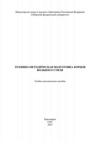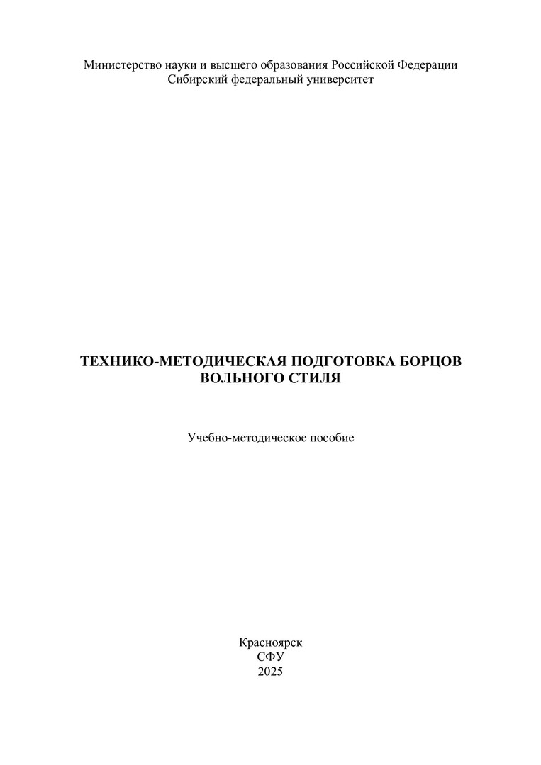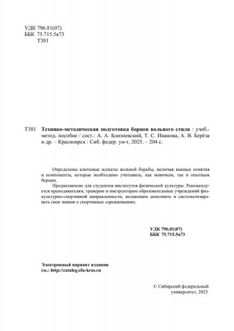 Библиографическое описание: Технико-методическая подготовка борцов вольного стиля : учебно-методическое пособие / Сибирский федеральный университет, Институт физической культуры, спорта и туризма ; сост.: А. А. Близневский, Т. С. Иванова, А. В. Береза [и др.]. - Электрон. текстовые дан. (pdf ; 11,3 Мб). - Красноярск : СФУ, 2025 (2025-06-16). - 204 с. : ил. - Загл. с титул. экрана. - Электрон. версия печ. публикации . - Библиогр.: с. 199-201. - 100 экз. - Изд. № 2025-24542 : Б. ц. - Текст : электронный.
