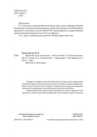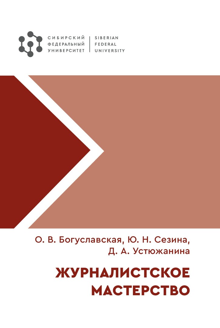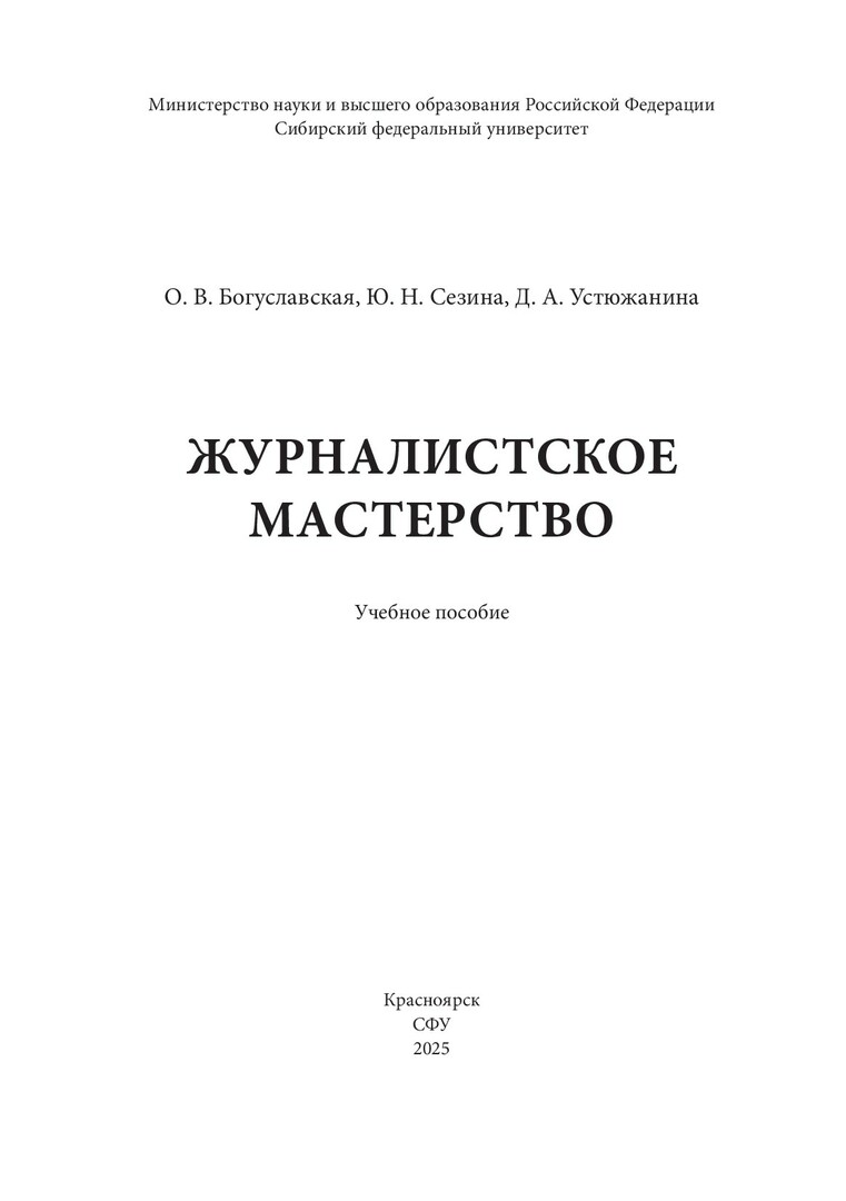 Библиографическое описание: Богуславская, Олеся Владимировна. Журналистское мастерство : учебное пособие / О. В. Богуславская, Ю. Н. Сезина, Д. А. Устюжанина ; рец.: Н. А. Вальянов, И. А. Хруль ; Сибирский федеральный университет, Институт филологии и языковой коммуникации. - Электрон. текстовые дан. (pdf ; 3,4 Мб). - Красноярск : СФУ, 2025 (2025-04-05). - 244 с., 15.3 усл. печ. л. - Загл. с титул. экрана. - Электрон. версия печ. публикации . - Библиогр.: с. 230-238. - 100 экз. - ISBN 978-5-7638-4908-0 : Б. ц. - Изд. № 2023-20488. - Текст : электронный.