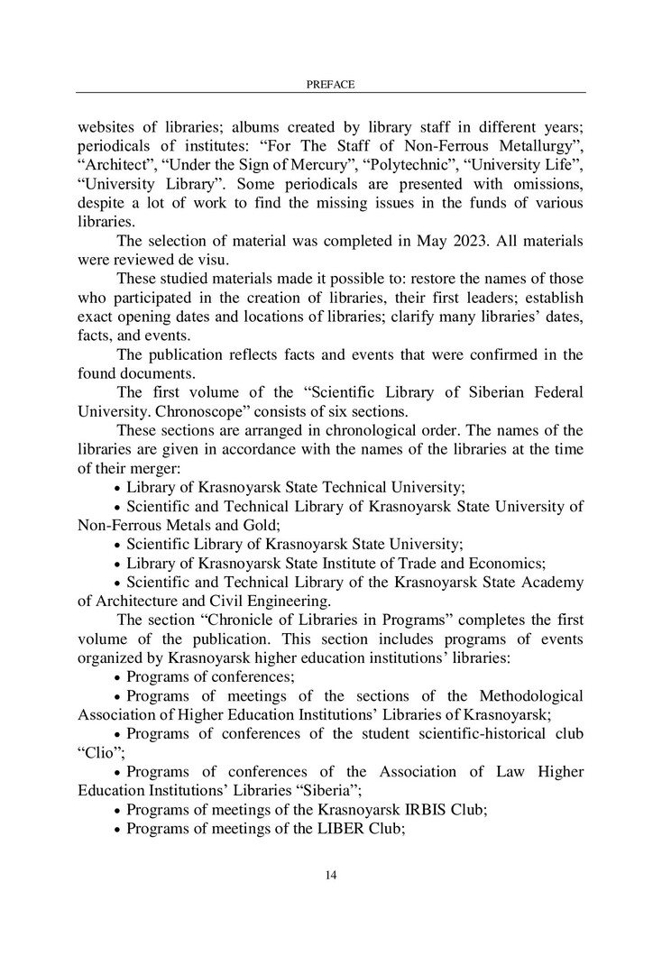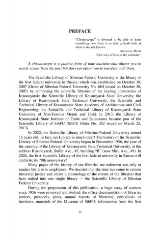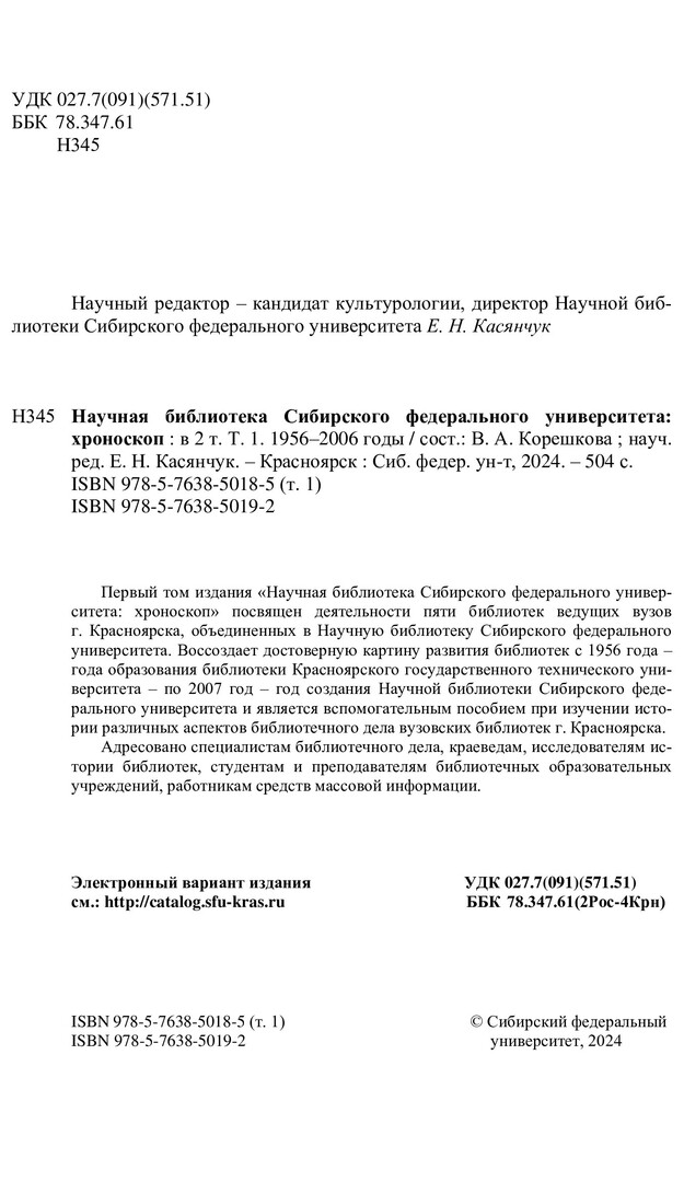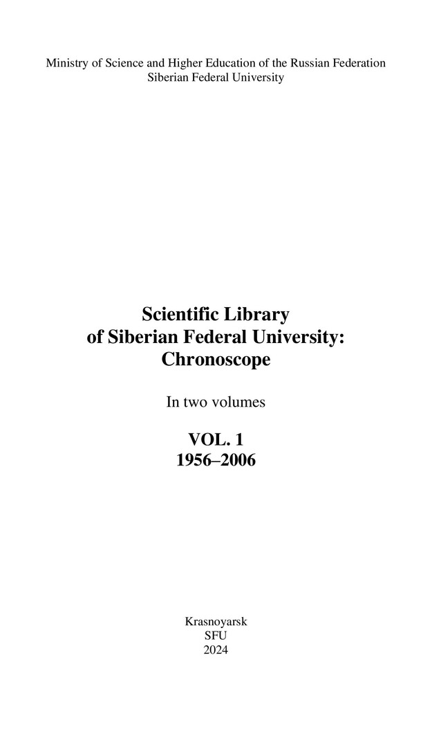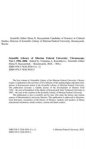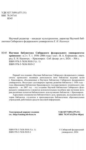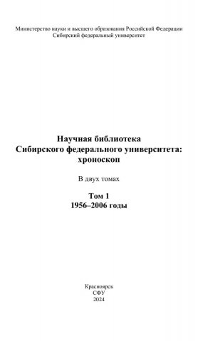 Библиографическое описание:Научная библиотека Сибирского федерального университета : хроноскоп / Министерство науки и высшего образования Российской Федерации, Сибирский федеральный университет, Научная библиотека; науч. ред. Е. Н. Касянчук ; авт.-сост. В. А. Корешкова ; ред.: С. Ю. Вакар, Г. И. Казакова ; ред.-библиогр. Н. М. Сафонова ; пер. В. А. Чистова. - Электрон. текстовые дан. (21 Мб). - Красноярск : СФУ, 2024 - . - Загл. с титул. экрана. - ISBN 978-5-7638-5019-2. - Текст : электронный. Т. 1 : 1956-2006. - 2024. - 503 с. - ISBN 978-5-7638-5018-5 : Б. ц.