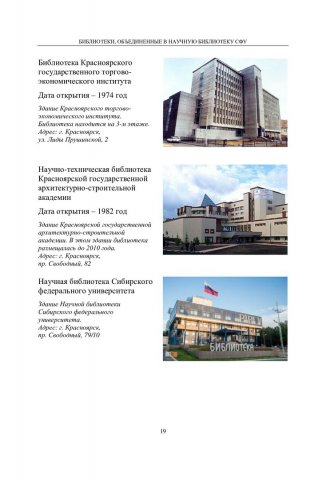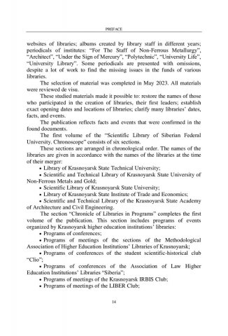 Аннотация:Первый том издания «Научная библиотека Сибирского федерального университета: хроноскоп» посвящен деятельности пяти библиотек ведущих вузов г. Красноярска, объединенных в Научную библиотеку Сибирского федерального университета. Воссоздает достоверную картину развития библиотек с 1956 года – года образования библиотеки Красноярского государственного технического университета – по 2007 год – год создания Научной библиотеки Сибирского федерального университета и является вспомогательным пособием при изучении истории различных аспектов библиотечного дела вузовских библиотек г. Красноярска. Адресовано специалистам библиотечного дела, краеведам, исследователям истории библиотек, студентам и преподавателям библиотечных образовательных учреждений, работникам средств массовой информации.