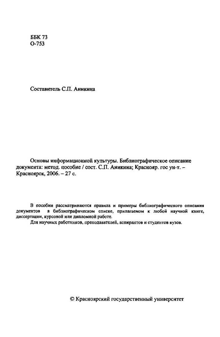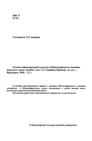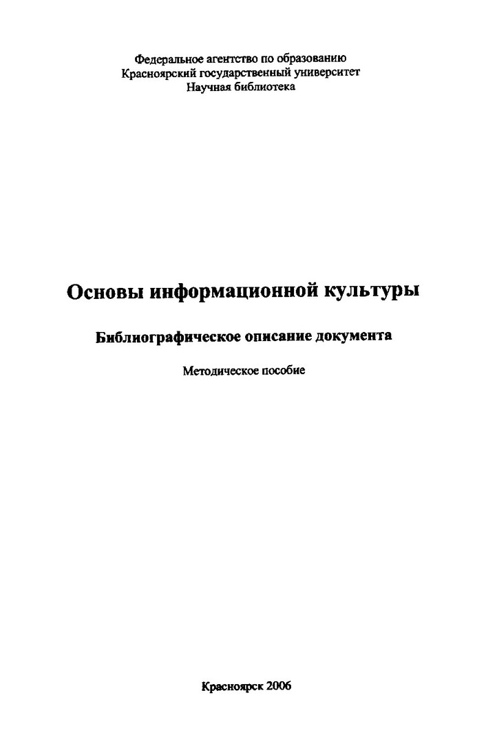 Библиографическое описание:Основы информационной культуры. Библиографическое описание документа : методическое пособие / Красноярский государственный университет, Научная библиотека ; сост. С. П. Аникина. - Красноярск : ИЦ КрасГУ, 2006. - 25 с. - (Электронная библиотека СФУ). - Текст : непосредственный : электронный.