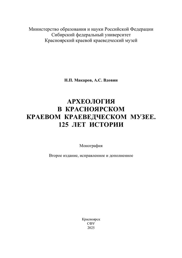 Библиографическое описание: Макаров, Николай Поликарпович. Археология в Красноярском краевом краеведческом музее. 125 лет истории : монография / Н. П. Макаров, А. С. Вдовин ; рец.: П. В. Мандрыка, А. Л. Заика ; Сибирский федеральный университет, Гуманитарный институт. - 2-е изд., испр. и доп. - Электрон. текстовые дан. (pdf, 45 Мб). - Красноярск : СФУ, 2025 (2025-09-18). - 208 с., 13.0 усл. печ. л. : ил. - Загл. с титул. экрана. - Электрон. версия печ. публикации . - Библиогр.: с. 184-206. - 500 экз. - ISBN 978-5-7638-5159-5 : Б. ц. - Изд. № 2025-25196. - Текст : электронный.