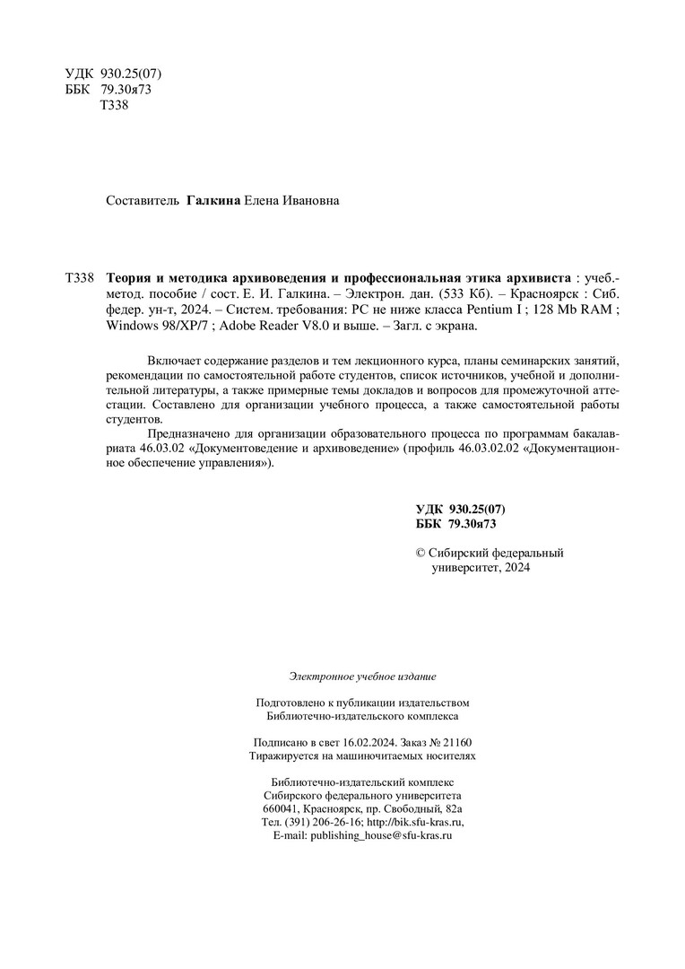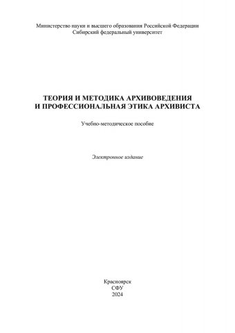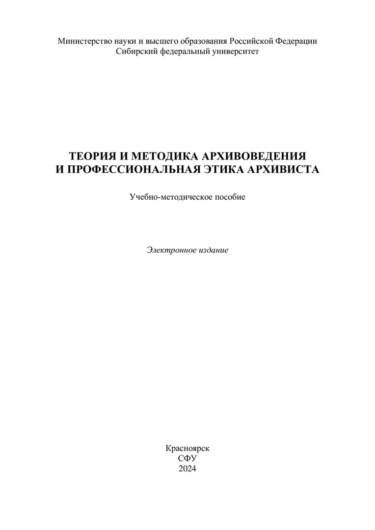 Библиографическое описание:Теория и методика архивоведения и профессиональная этика архивиста : учебно-методическое пособие / Сиб. федер. ун-т, Гуманитар. ин-т ; сост. Е. И. Галкина. - Электрон. текстовые дан. (pdf, 0,6 Мб). - Красноярск : СФУ, 2024 (2024-02-16). - 20 с. - Загл. с титул. экрана. - Изд. № 2024-21160 : Б. ц. - Текст : электронный.