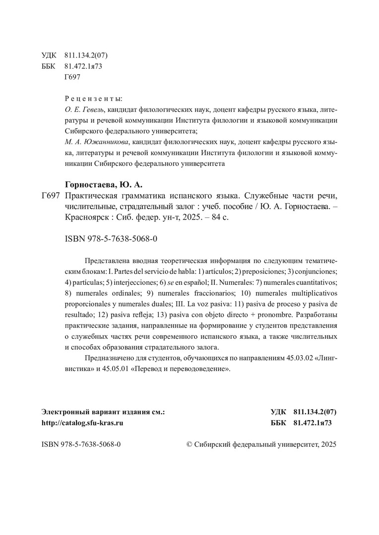 Библиографическое описание: Горностаева, Юлия Андреевна. Практическая грамматика испанского языка: служебные части речи, числительные, страдательный залог : учебное пособие / Ю. А. Горностаева ; рец.: О. Е. Гевель, М. А. Южанникова ; Сибирский федеральный университет, Институт филологии и языковой коммуникации. - Электрон. текстовые дан. (pdf, 2.5 Мб). - Красноярск : СФУ, 2025 (2025-09-15). - 84 с., 5.2 усл. печ. л. : табл. - Загл. с титул. экрана. - Электрон. версия печ. публикации . - 100 экз. - ISBN 978-5-7638-5068-0 : Б. ц. - Изд. № 2024-23094. - Текст : электронный.